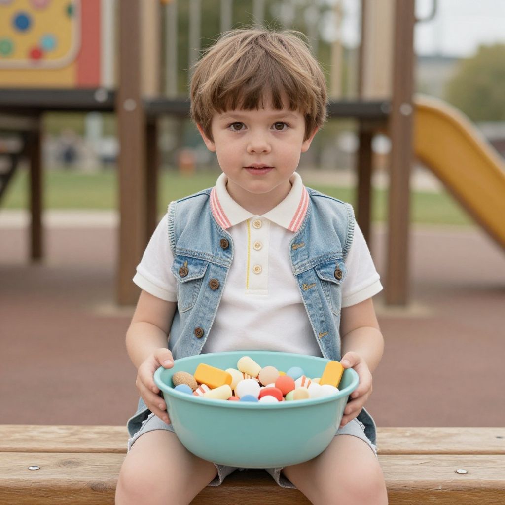 Bowl cut child dressed in retro 90s style clothing, sitting on a wooden bench in a lively playground, capturing the innocence and charm of childhood in a nostalgic pastel color palette.