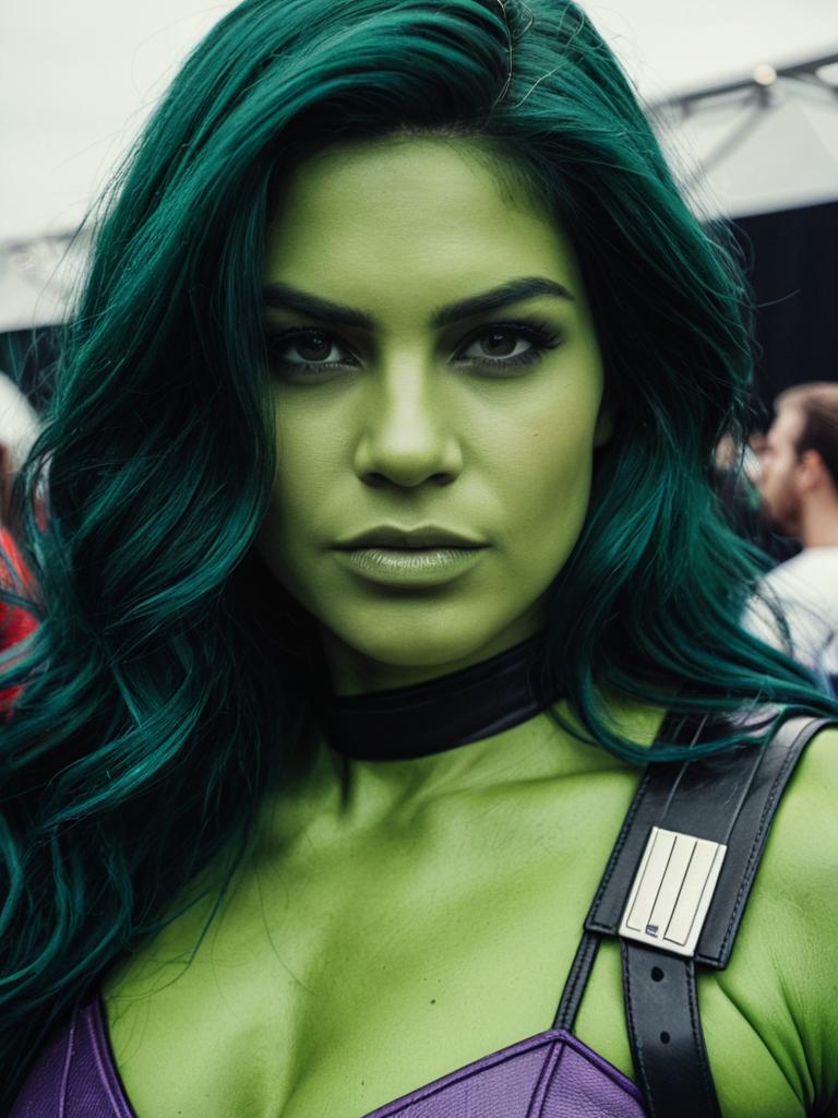 Woman in She Hulk costume, cosplay festival portrait, realistic detail