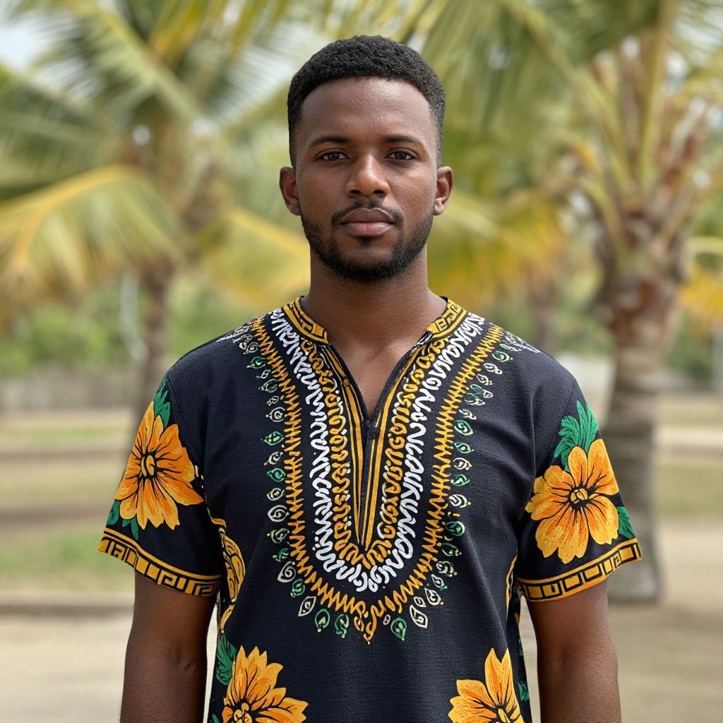 Photograph of a young Black man with short, neatly trimmed hair and a trimmed beard, standing outdoors. He wears a black, short-sleeved shirt adorned with vibrant orange hibiscus flowers and intricate white and yellow embroidery along the neckline and sleeves. The background features blurred palm trees and a grassy area, suggesting a tropical or subtropical location. The man's expression is neutral, and he gazes directly at the camera. His skin is smooth and dark, and the shirt's texture appears slightly textured, typical of traditional African clothing.