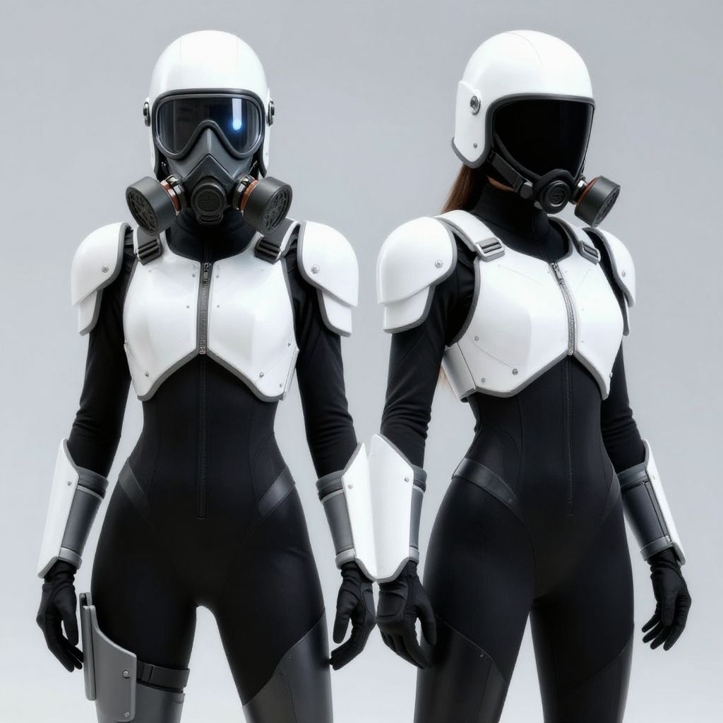 Combine assassin, 1girl, solo, helmet, faceless, gloves, military, science fiction, gas mask, shoulder armor, bulletproof vest, one-eyed, glowing eye, petite, black bodysuit, white armor