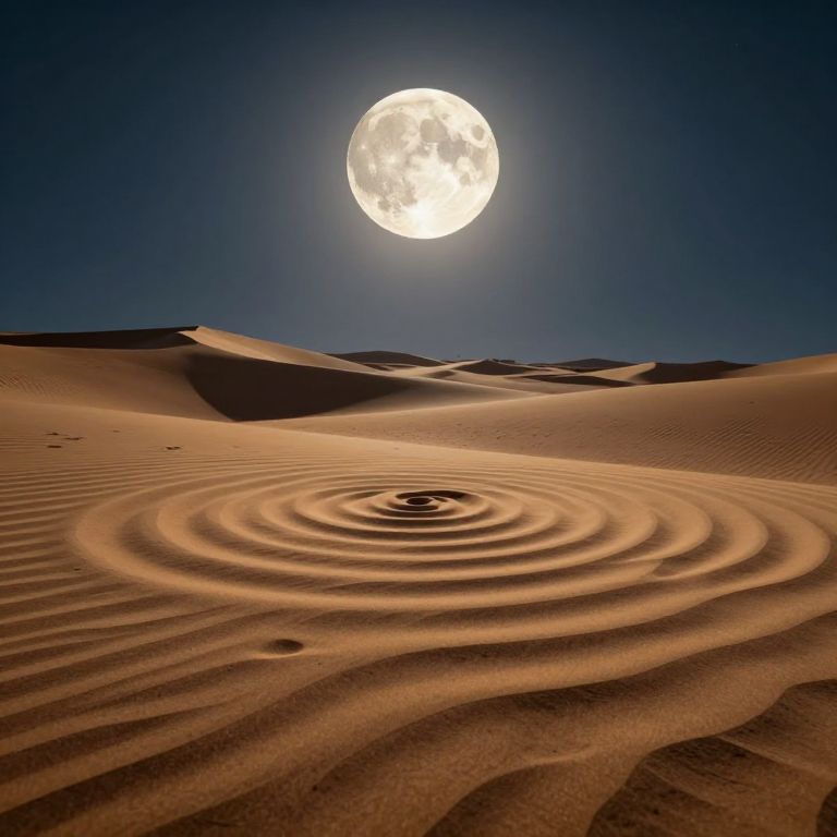 Golden sand cascades from a luminous moon, creating concentric rings of light and shadow on a rippling desert floor, evoking a surreal dreamscape where celestial and terrestrial realms converge.