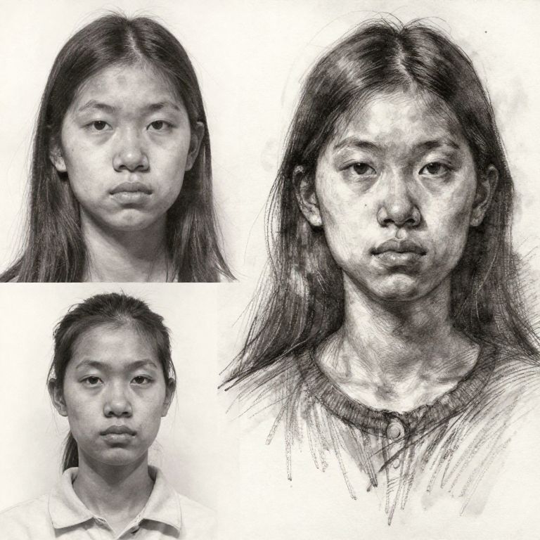 Turn photos into drawings of portraits, focusing on expressive charcoal sketching techniques, emphasizing facial features, soft blending, strong contrasts, and textured strokes creating an emotional and timeless hand-drawn look.
