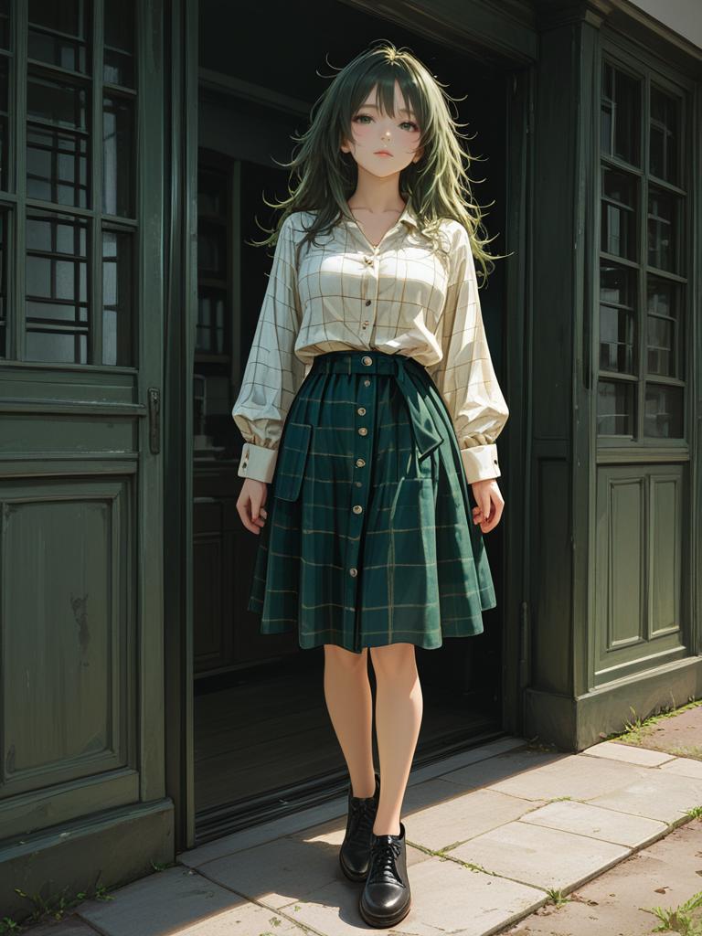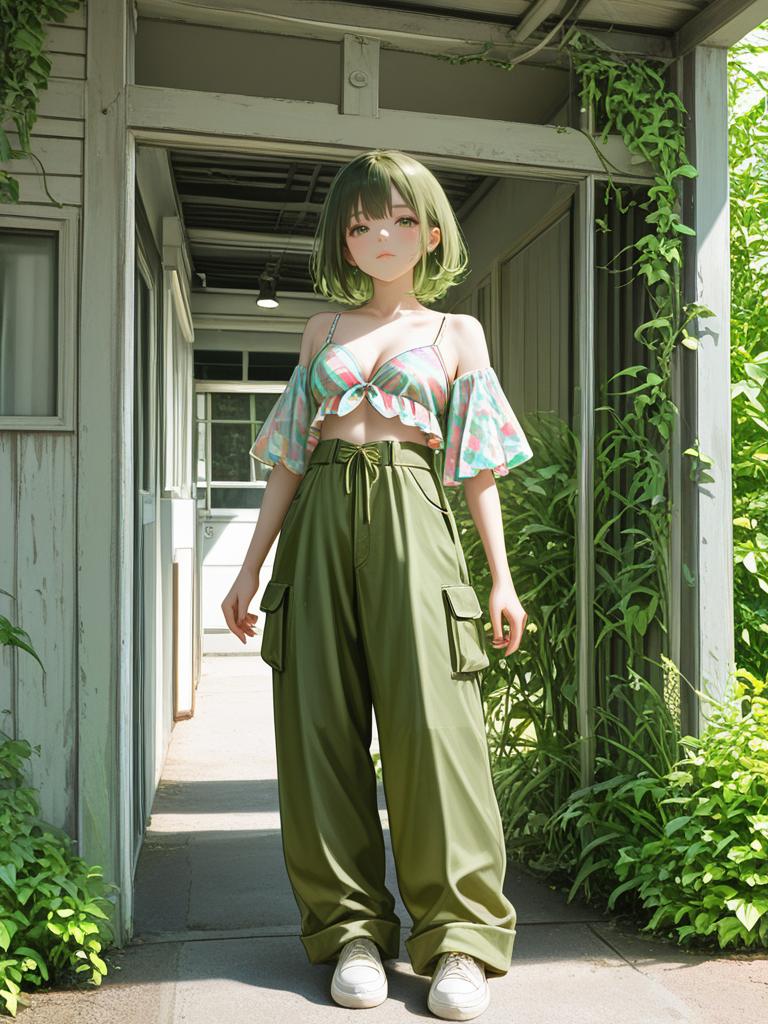 Full body portrait of a young woman with short green hair wearing a pastel-colored printed bikini top with adjustable thin straps and a front knot, paired with high-waisted olive green cargo pants and white sneakers. The background shows a rustic outdoor space with plants and a shaded walkway.