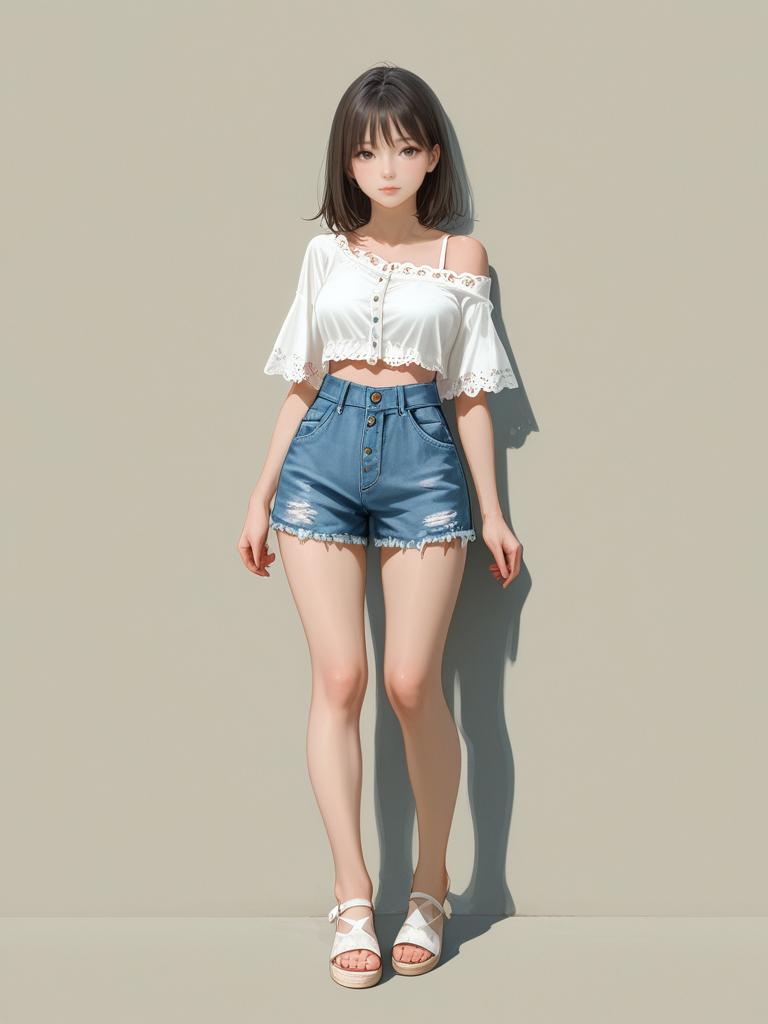 1girl, realistic face, full body shot, Woman, casual summer style, printed bikini top in pastel colors with multicolored speckled pattern, adjustable thin straps, straight neckline, center front knot, high-waisted olive green cargo pants, photo studio background with a plain light backdrop.