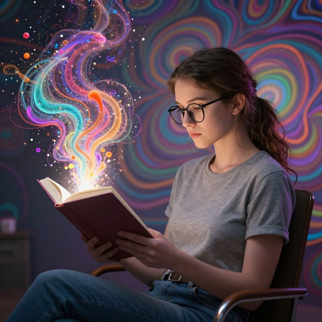 Photograph of a young woman with fair skin and brown hair in a ponytail, wearing glasses, a gray t-shirt, and blue jeans. She sits in a black chair, intently reading an open book, with vibrant, swirling, multicolored flames emerging from the book's pages. The background features a dark, psychedelic swirl pattern in hues of blue, green, purple, and orange. The image has a magical, surreal quality, with the flames adding a dynamic, otherworldly element. The lighting is focused on the book and flames, creating a contrast with the darker background.