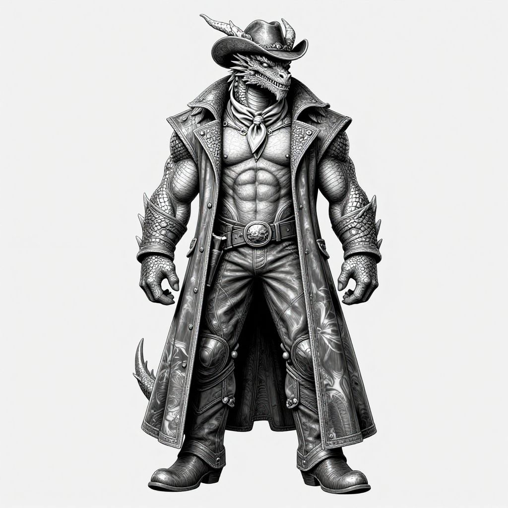 Digital illustration of a green, cactus-like humanoid with spines, red eyes, brown leather harness, and belt, standing in desert flora, framed