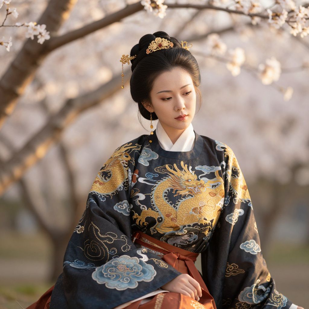 A detailed portrait of a Chinese fancy dress woman in a classic dragon-and-clouds hanfu, sitting in a serene garden with cherry blossoms in full bloom, her face elegant and serene with finely shaped eyebrows and a serene expression, the golden light filtering through the trees enhancing the rich fabric of her costume.. The woman has big breasts and cute face