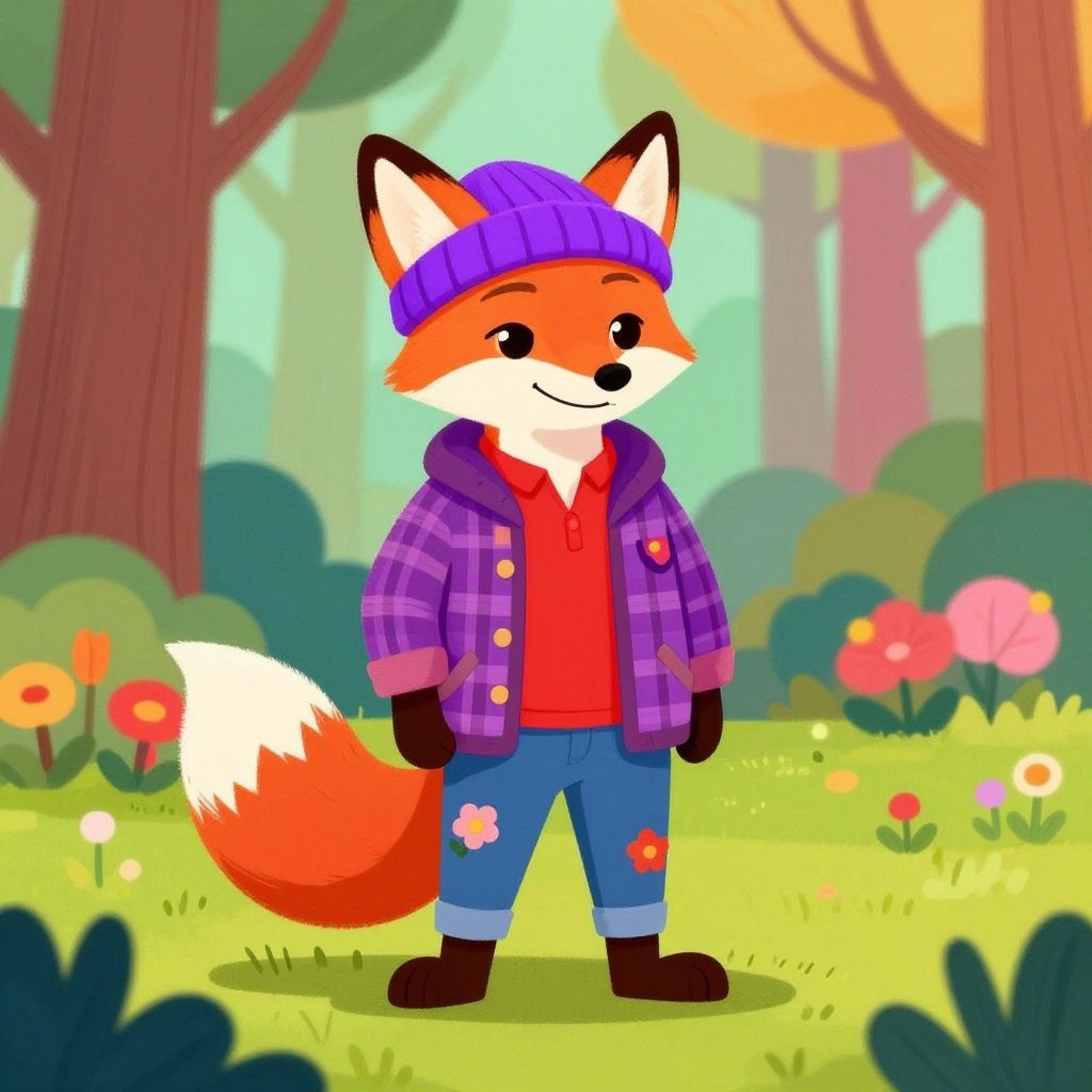 Vibrantly illustrated anthropomorphic fox wearing a purple beanie, plaid jacket, red shirt, and blue jeans adorned with floral patches. The fox stands confidently in a brightly colored forest with multi-colored trees and flowers, showcasing a whimsical and cheerful outdoor scene.