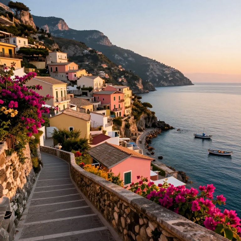 Photograph of a picturesque coastal Italian village at sunset, featuring colorful houses, blooming pink flowers, stone pathway, calm blue sea, and small boats