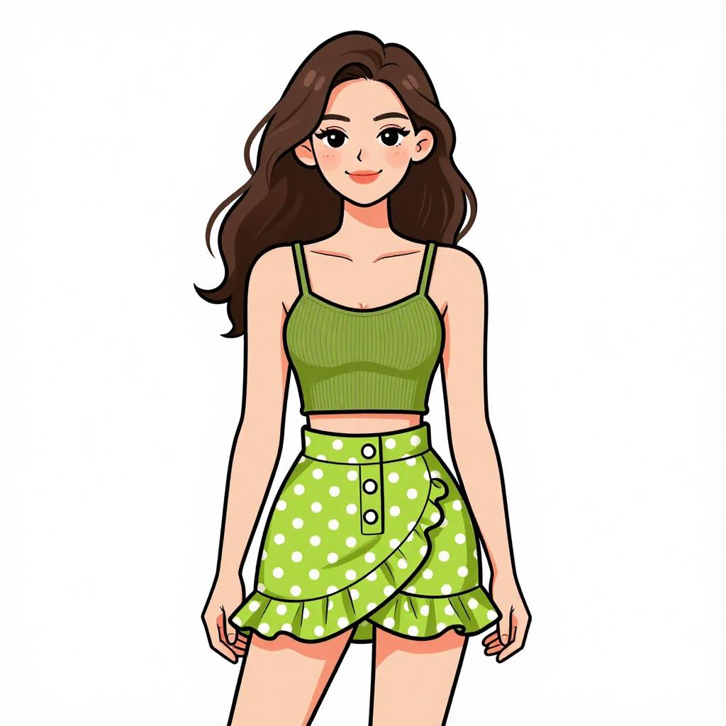 Digital drawing of a young woman with long, wavy brown hair and fair skin. She wears a green, ribbed, spaghetti-strap crop top and a high-waisted, green skirt with white polka dots and a ruffled hem, featuring two large buttons on the left side. She has a subtle smile, black eyes, and a slightly relaxed posture. The background is plain white, emphasizing the character. The style is vibrant and cartoonish, with bold outlines and bright colors.
