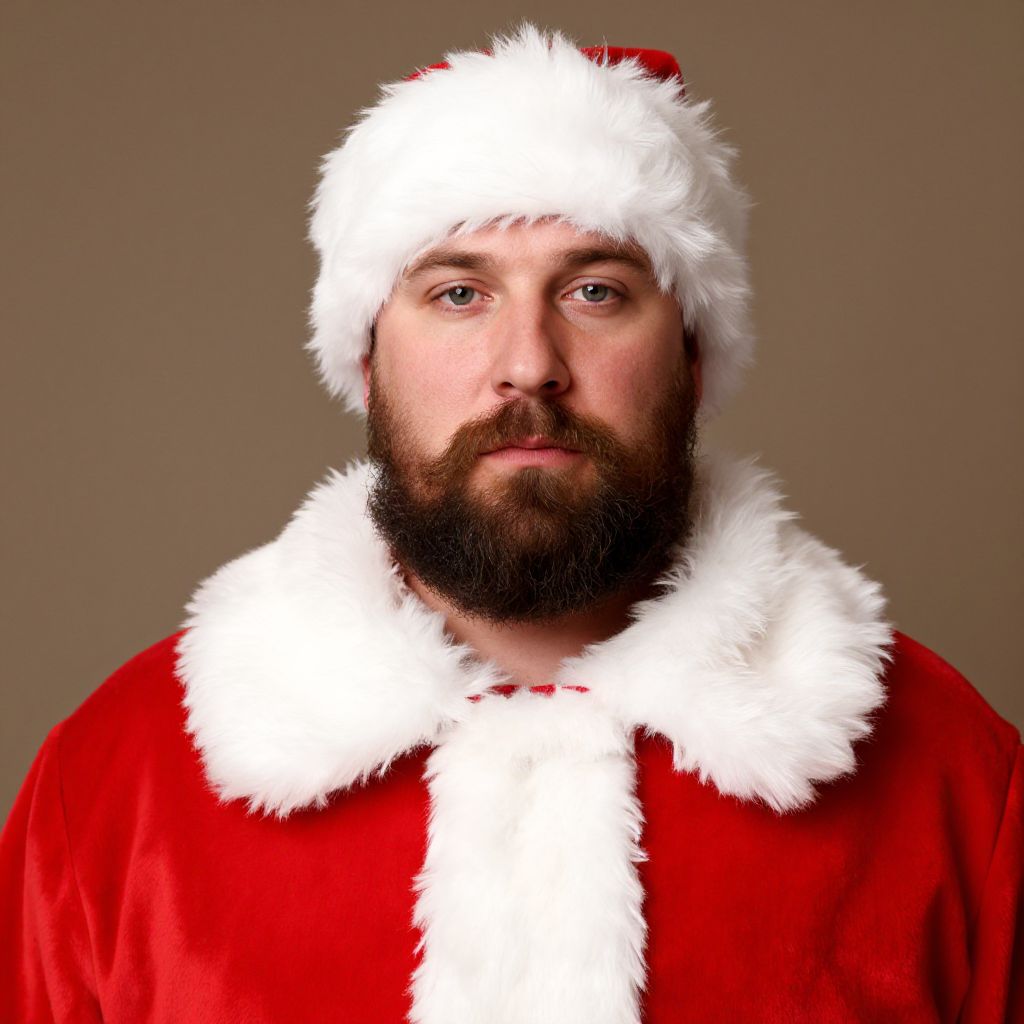 Photograph of a bearded man with fair skin, wearing a red Santa hat and red velvet coat with white fur trim, against a plain brown background