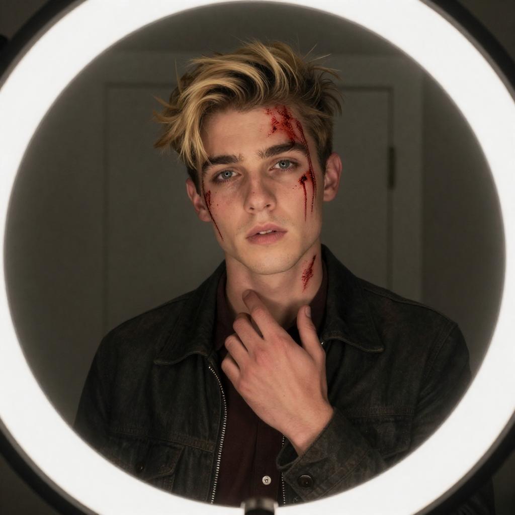 Photograph of a young man with short blonde hair, blood streaked across his face, looking intently at the camera. He wears a dark jacket over a brown shirt, with one hand near his neck. Background shows a closed door. Viewed through a circular frame in the foreground.