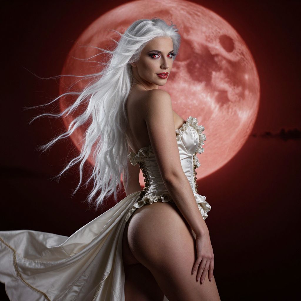 Award wining professional erotic artistic boudoir photography, A cinematic masterpiece unfolds as the stunning professional european female model, resplendent in a flowing Victorian dress, stands majestically against an eerie backdrop of a colossal blood moon, Her long white locks flow like silk in the wind, framing her striking features with piercing red eyes and subtle makeup, The camera captures her sultry smile, lips painted red, as she gazes back, her enigmatic eyes radiating mystery and allure, Extreme lighting casts dramatic shadows on her bare skin, accentuating the flowing pubic hair, set against meticulous details that transport the viewer into a movie special effects style wonderland