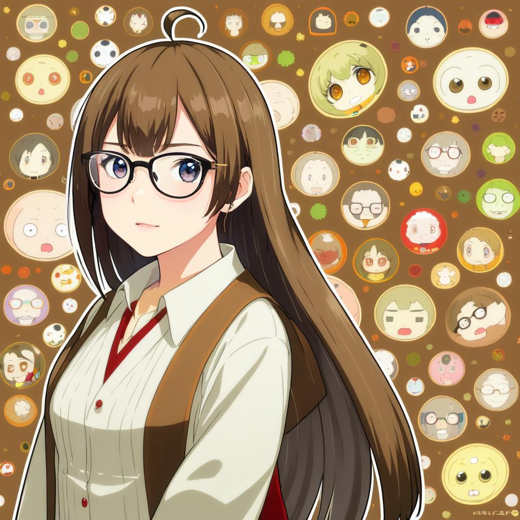 Anime-style illustration featuring a young girl with long brown hair and glasses, wearing a white shirt with a red collar detail and a brown vest. The character has distinctive ahoge hairstyle strand. The background is filled with various small circular anime faces and characters with expressive emotions on a brown backdrop.