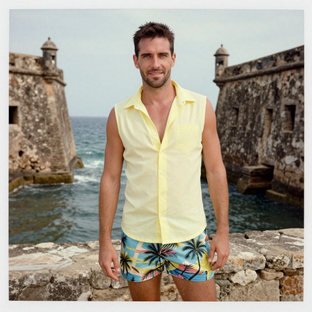 A man, charcoal grey linen shirt, patterned swim trunks, black espadrilles, mangrove forests, brackish water, bustling fishing boats, polaroid instant camera style, relaxed expression, sunlit ambiance. Man has masculine face and piercing eyes