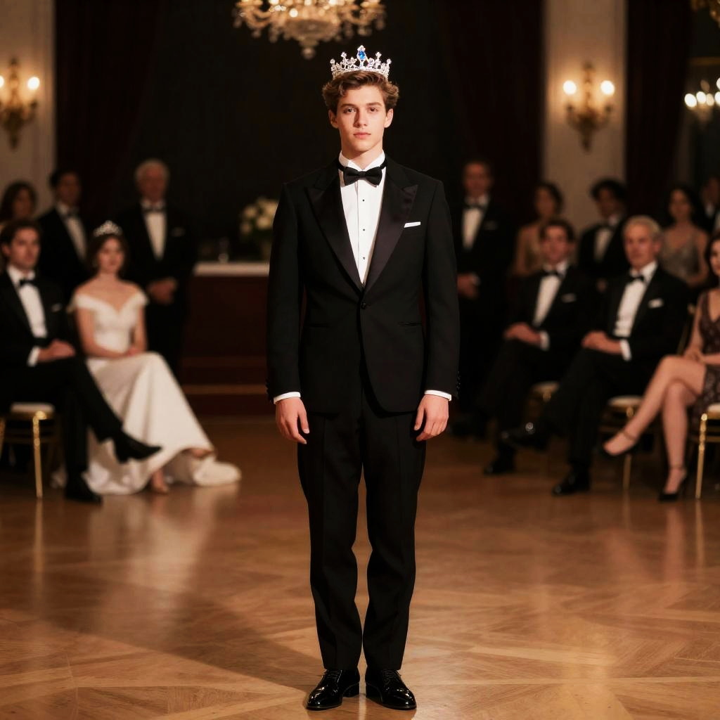 Realistic photo.(Masterpiece-1.5), RAW photo, film grain, (best quality-1.5), (photorealistic), realistic, real picture, intricate details, photo of full body a dapper young man in a tuxedo, ballroom background, diamond crown on head, (((dark background))) realistic photo