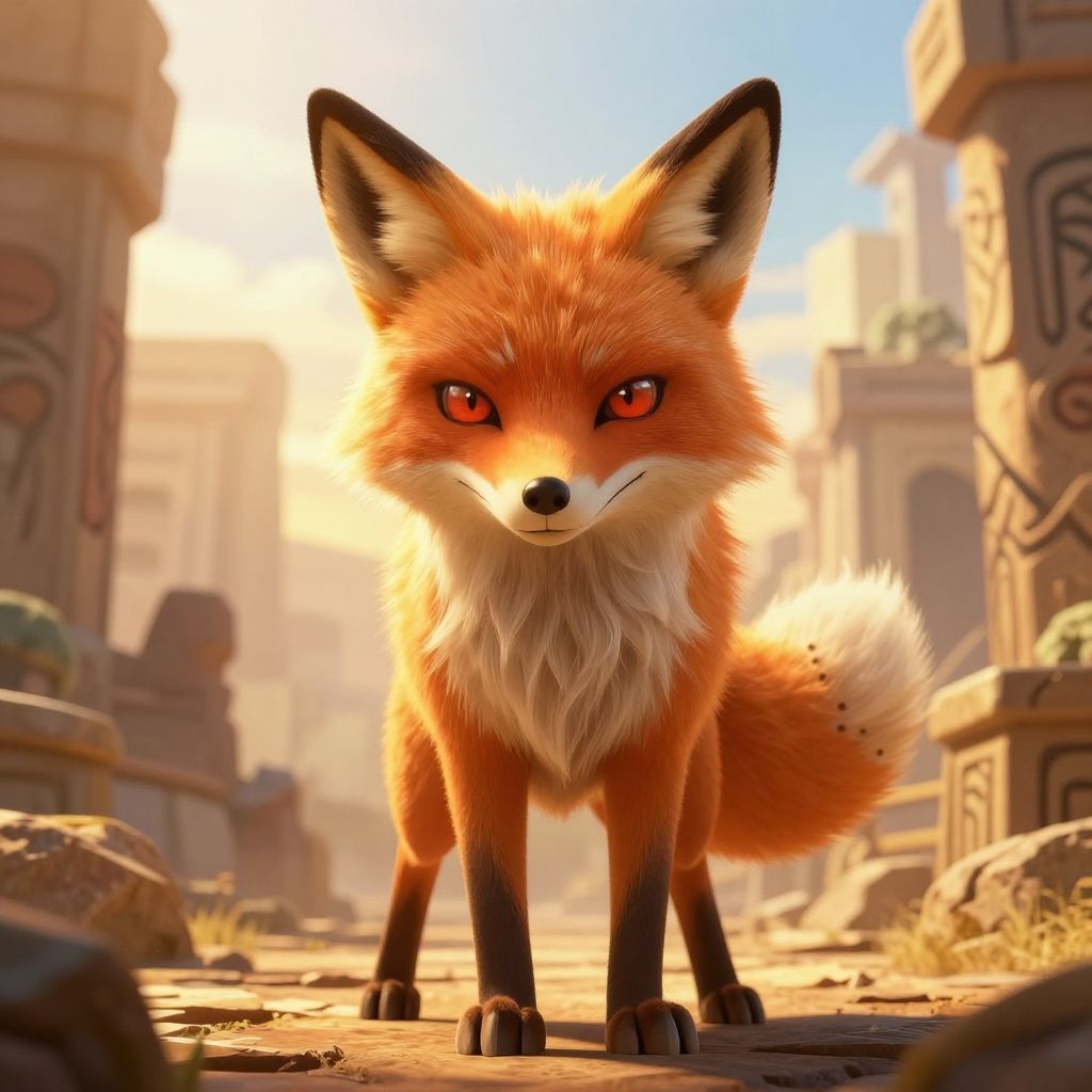 Digital artwork of a fox inspired by Pokémon characters, featuring detailed fur patterns and tribal markings. The fox has a fierce expression and stands amidst ancient ruins with warm golden hour lighting, evoking an epic fantasy atmosphere and cinematic composition.
