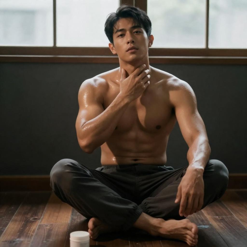 Shiny, muscular Asian man with short black hair, sitting cross-legged on a wooden floor, shirtless, wearing loose dark pants. Warm yellow light illuminates his glistening, oiled skin. Right hand touches his neck, left hand rests on his knee. Small white container in front. Background includes dark, ured wall and frosted window panels.