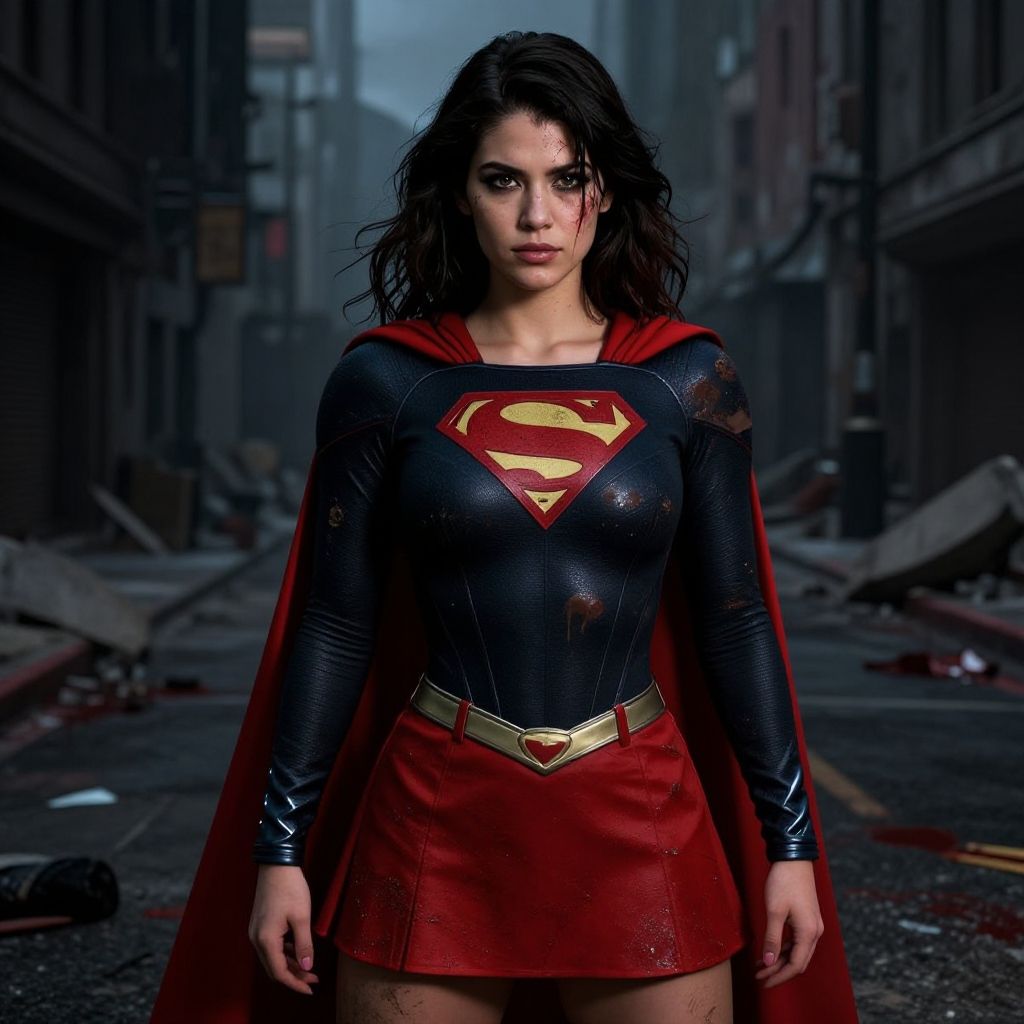 Ultra-realistic digital painting of an beautiful 21-year-old hispanic Supergirl, Ultra-realistic body, Beautiful Attractive hispanic Post-Apocalyptic Supergirl, realistic dirty tight black combat costume, red miniskirt, red cape, standing defiantly amidst a dark street, sinister ruined street city, blood-stained and smeared with dirt, wearing a tight, a slight smudge of dirt tracing her flawless complexion, with wavy back hair disguising part of her realistic dirty and bloodstained face, realistic beautiful brown eyes, defiant and seductive, covered in dirt and blood, cinematic colors Lighting, extremely detailed, 8K