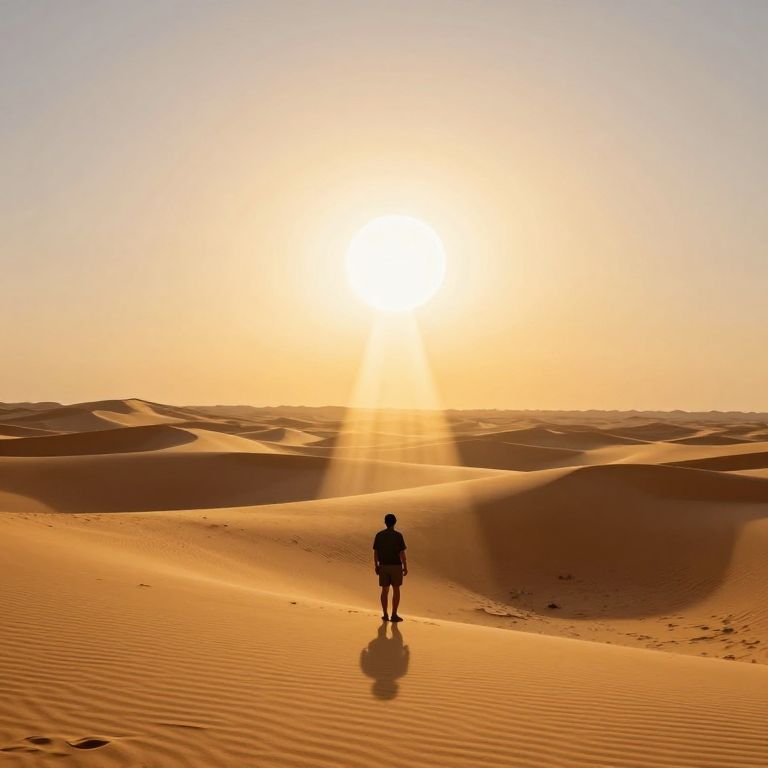 Photograph of a solitary figure standing in a vast, sunlit desert with golden sand dunes. The person, silhouetted against the bright, low sun, wears a dark jacket and pants, and a hat, casting a long shadow on the rippled sand. The sky is clear with a gradient from yellow to light blue. The sun's rays create a shimmering pathway across the dunes, enhancing the texture of the sand. The scene evokes a sense of solitude and vastness, with the desert stretching out to the horizon.