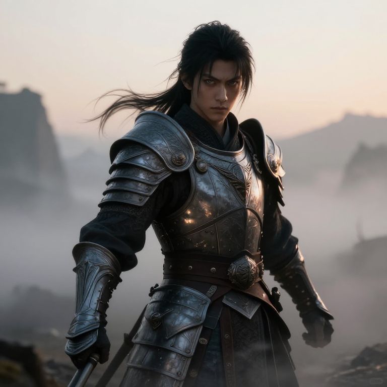 Fantasy warrior with grey eyes black hair, standing on a misty battlefield at dawn, intricate armor reflecting early morning light, fierce expression, swirling fog around, dynamic pose, highly detailed textures and realistic shadows
