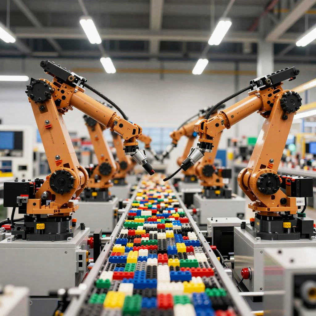 Lego factory robots assembling colorful bricks in a futuristic production line, bright factory lights, detailed mechanical arms, high-tech industrial environment, vibrant colors