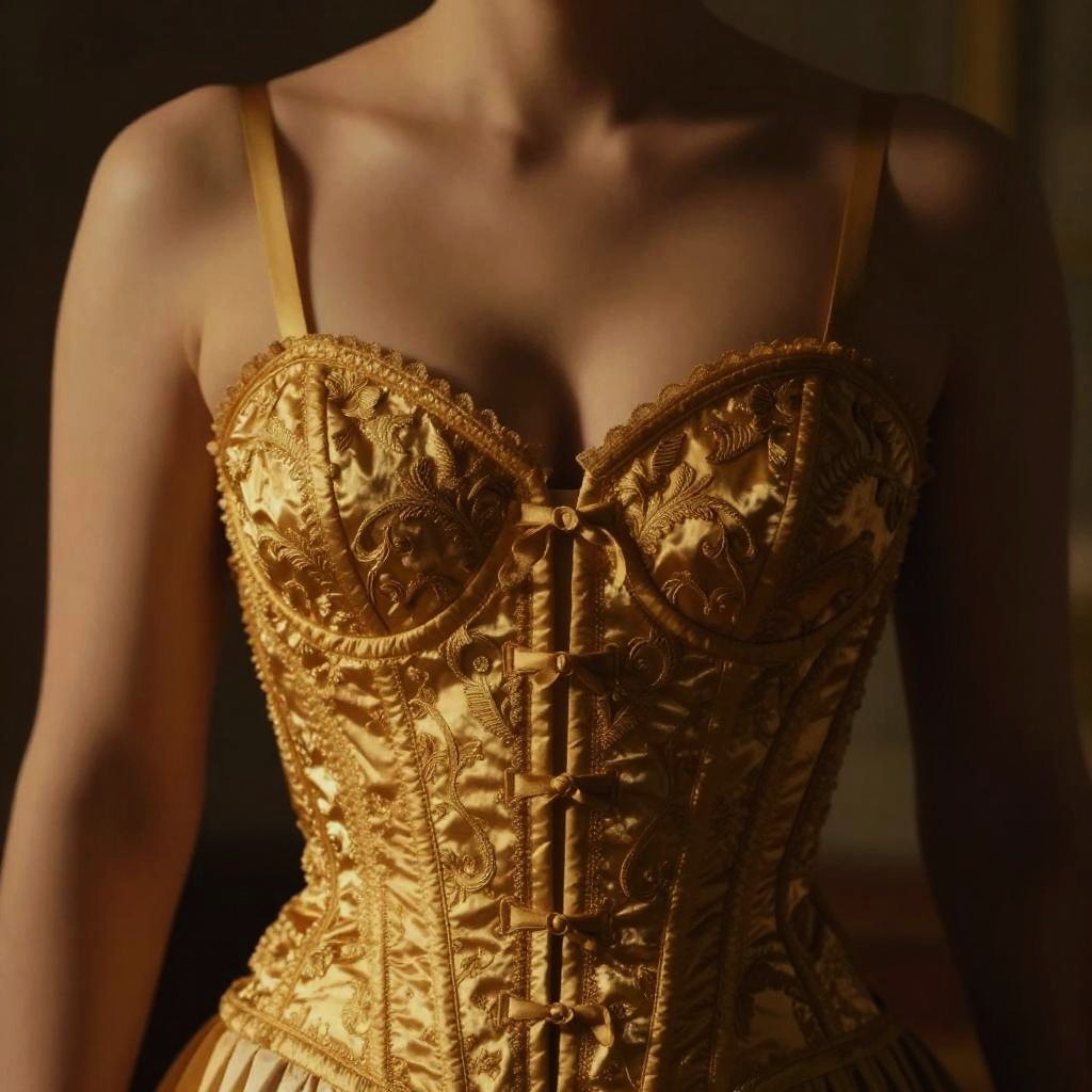 Photograph of a woman's chest in a gold, intricately embroidered corset with floral patterns, highlighting her cleavage and slender frame.