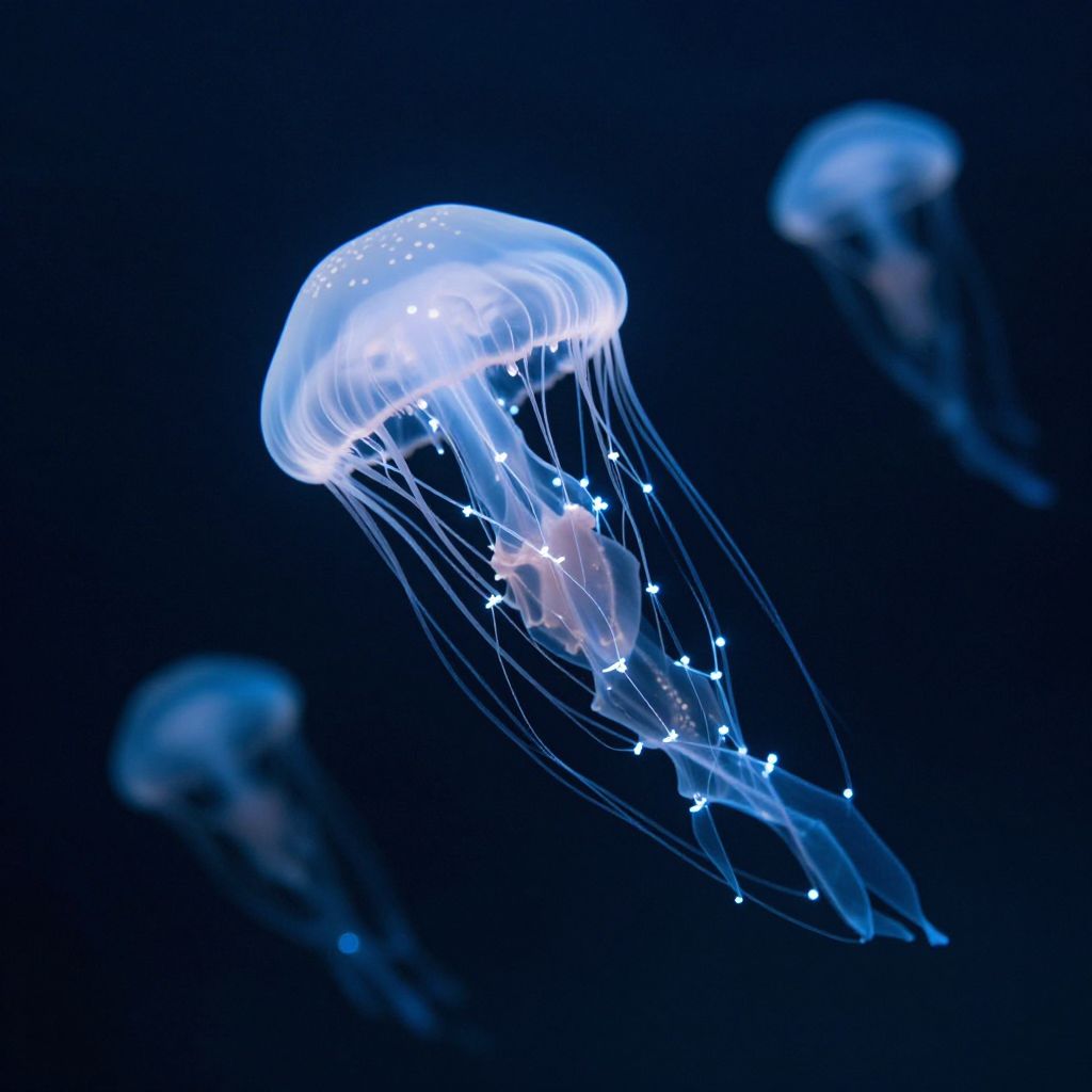 Amidst the abyssal depths of an enigmatic ocean, ethereal jellyfish weave luminous threads of mathematical elegance, their bioluminescent forms dancing like celestial choreographers in a silent symphony of logic and wonder.