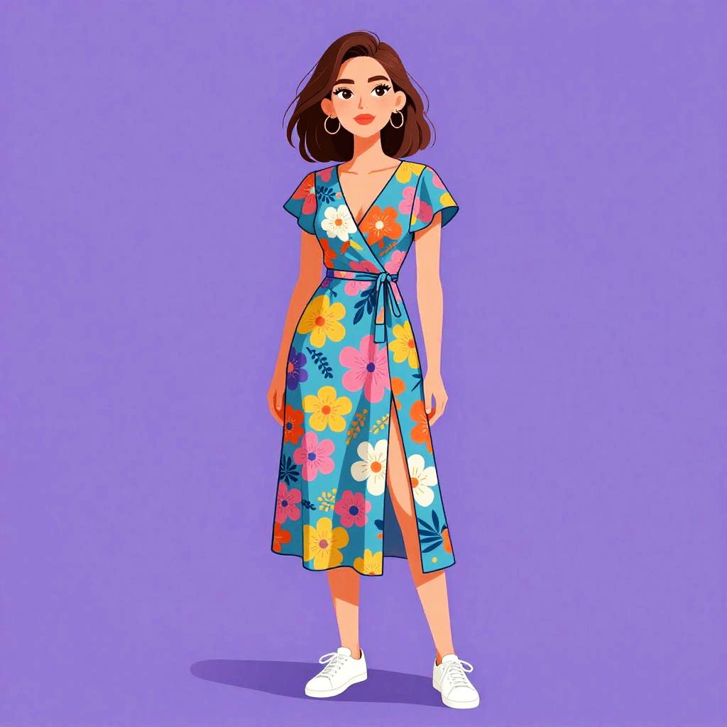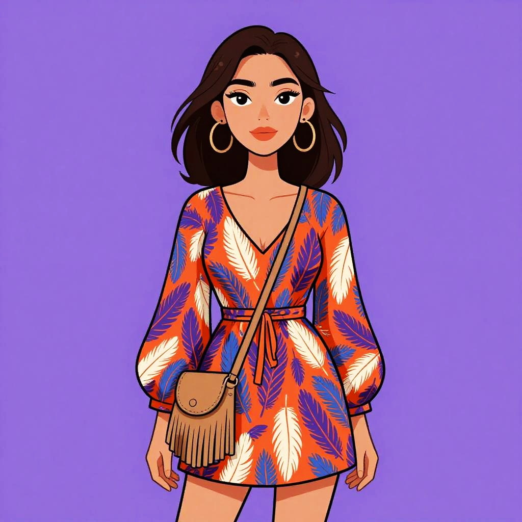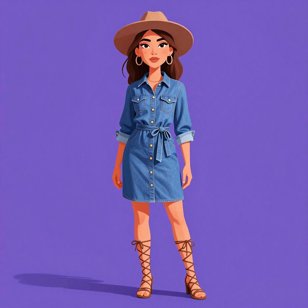 Woman with pretty face and pretty hair. Woman, bohemian chic, denim shirt dress, knee-length, long sleeves with buttoned cuffs, pointed collar, button-down front, tie belt at waist, taupe wide-brimmed felt hat, strappy gladiator sandals ascending to mid-calf, studio background. --sref 1467