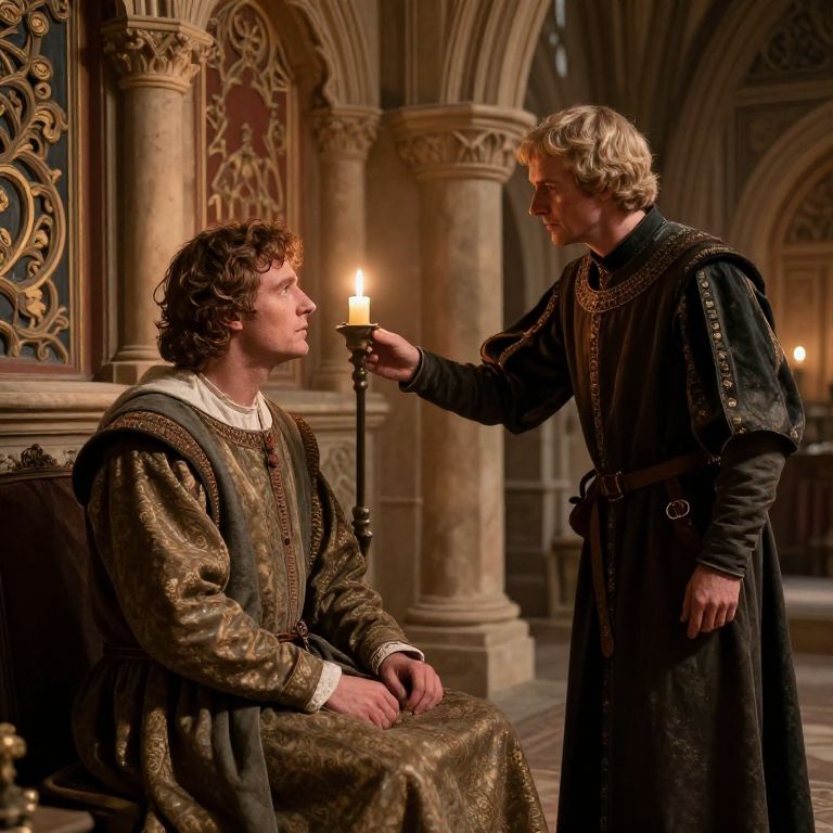 Dienen concept depicted as a medieval servant gracefully attending to a noble, intricate castle interior, warm candlelight, detailed period clothing, realistic textures, soft shadows, emphasis on humility and loyalty, historical atmosphere, rich color palette.