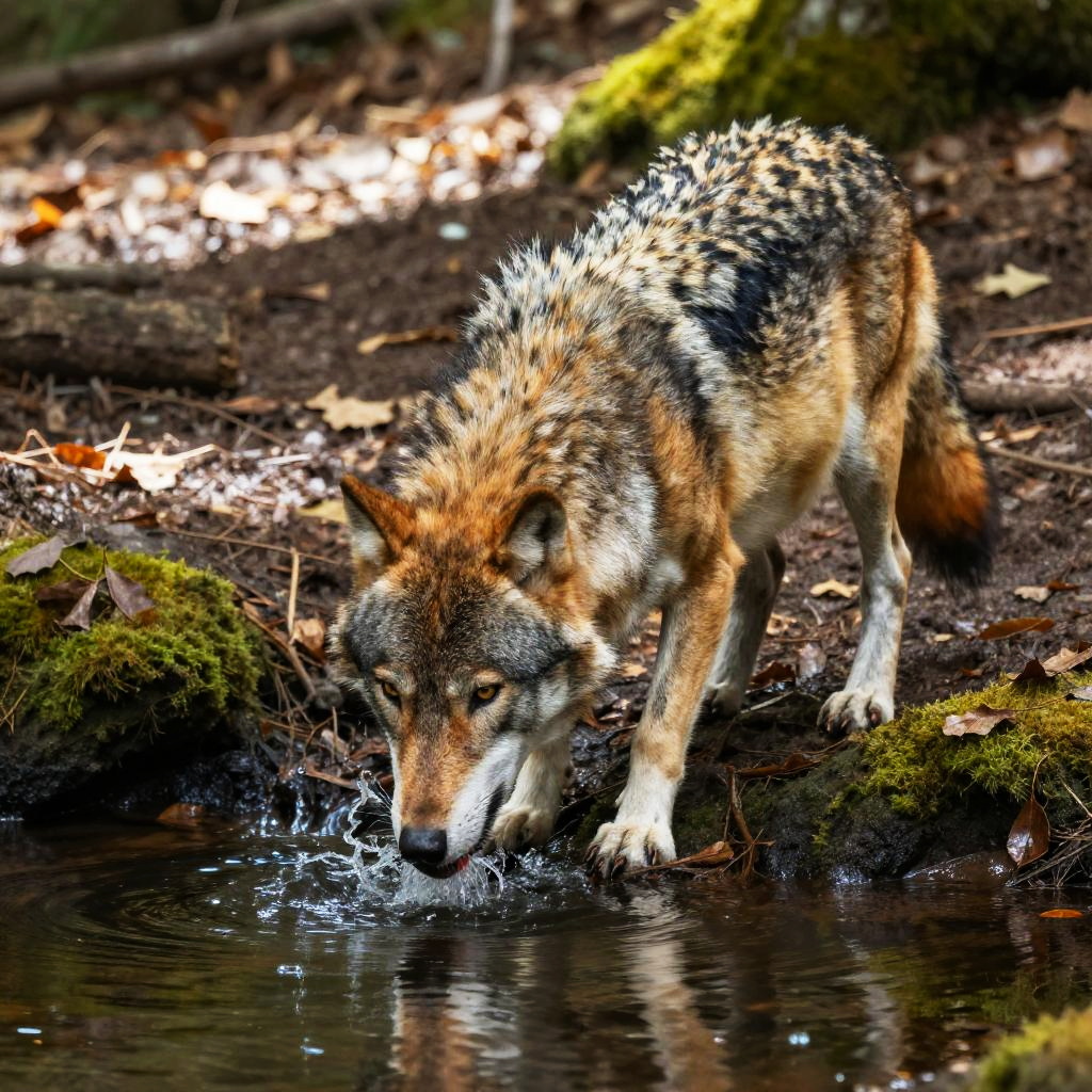 A powerful wolf crouched by a bubbling river, drinking water amidst sun-dappled forest floor, intricate textures of moss and fallen leaves, dynamic composition with natural lighting, immersive and realistic wildlife moment.