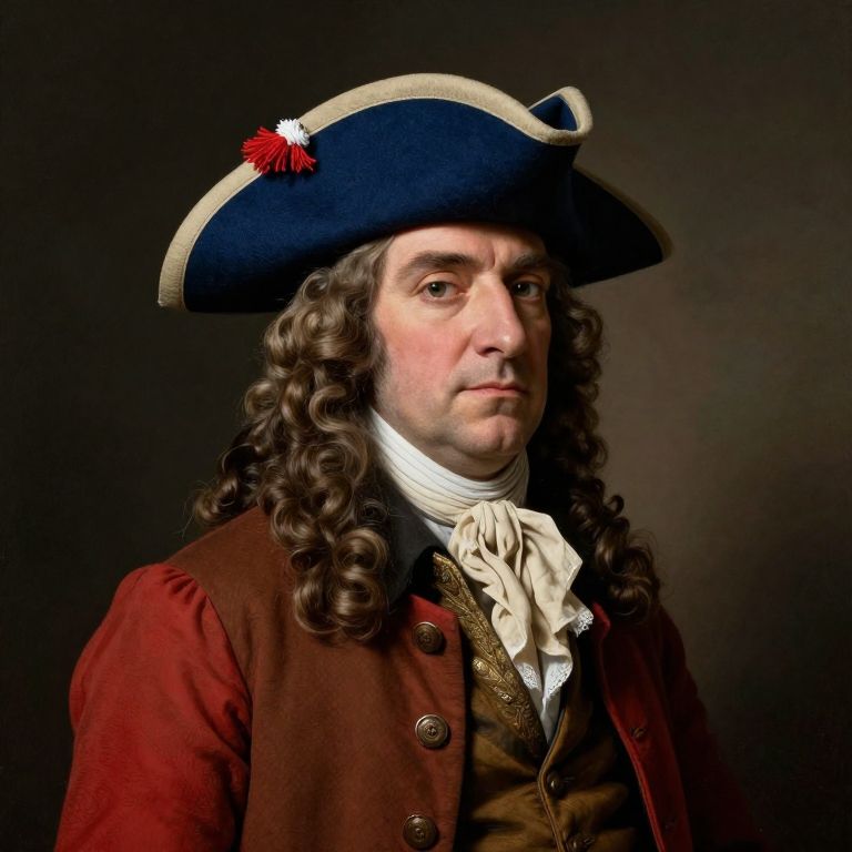 A 1700s explorer, John Lawson, is depicted in a historically accurate portrait, wearing a blue tricorn hat with red and white tassels, a brown and red coat, and a beige scarf, with intricate details and dramatic lighting.