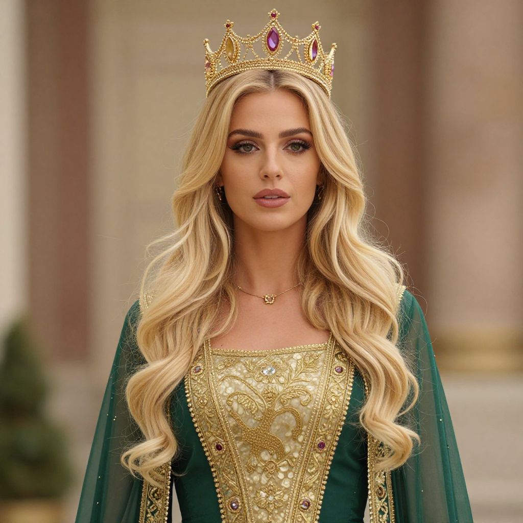 Woman with long blonde hair wearing a green and gold dress with a crown on her head.