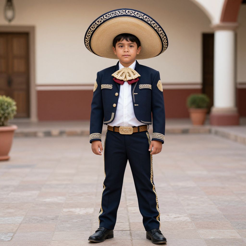 Photograph of a young boy in traditional Mexican attire, wearing a large sombrero, navy suit with gold trim, white shirt, and black shoes,