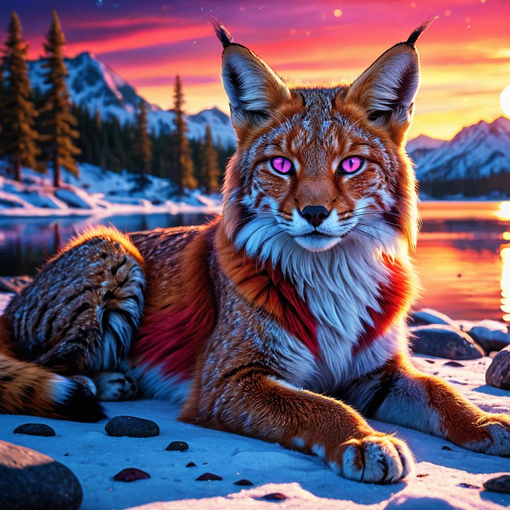 Portrait of a beautiful young sapphire lynx with lustrous crimson stripes and glowing, jubilant violet eyes. Styled as a cunning, graceful hunter, this epic anime portrait is a close-up in fiery colors with a brilliant sunrise backdrop. The fox’s piercing, majestic eyes shine in 8K resolution against a deep, starry sky with cosmic auroras. The scene features elements like frost, colorful stones, and glistening crimson striped fur in a fine oil painting style. The fox is sprawled elegantly at a sun-bathed lake shore, captured with precise proportions and vibrant, complementary colors. Rendered in UHD, HDR, with hyper-detailed, soft HD fur and a beautiful background in top-quality artwork, inspired by Unreal Engine 5. Perfect for ArtStation, DeviantArt, and Instagram.