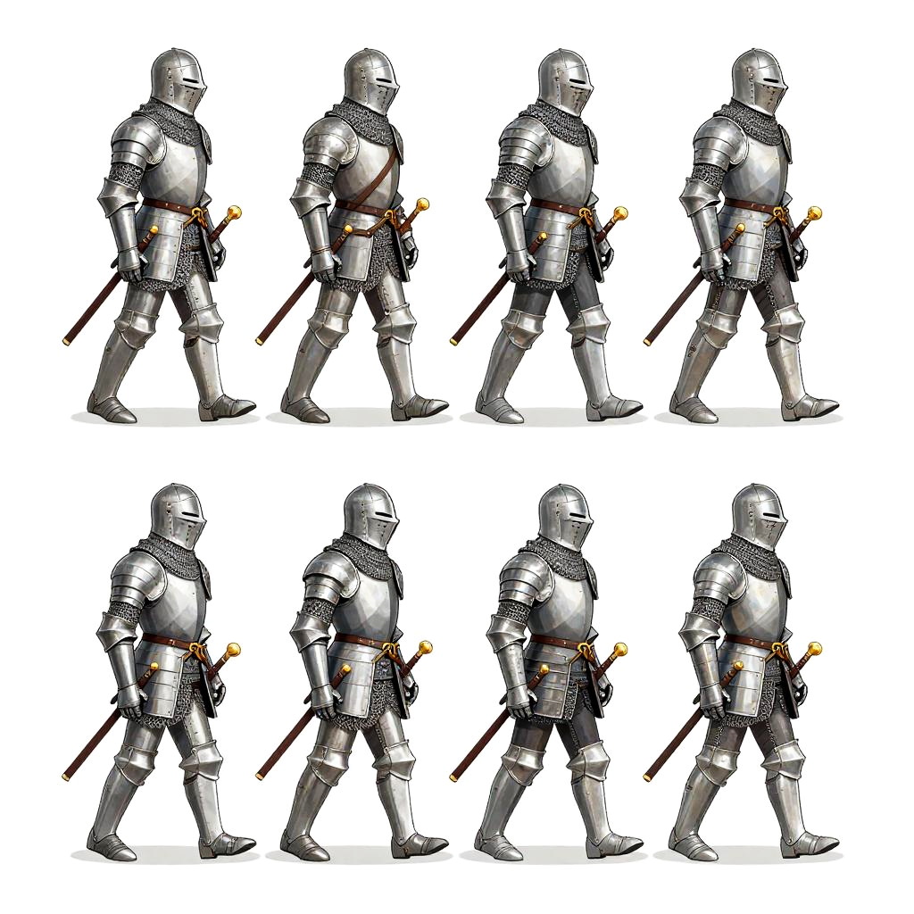 Walking animation sheet of a medieval knight in armor walking, realistic proportions, dynamic stride, detailed chainmail and helmet, grayscale with shading, 8 frames, classic sprite sheet format