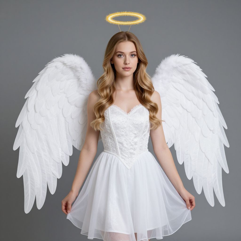 Photograph of a young woman with long, wavy blonde hair, wearing a white, lace-trimmed, sleeveless dress with a flared skirt. She has large, white, feathered angel wings and a glowing, golden halo above her head. Her expression is calm and serene. The background is a solid, gray color, emphasizing her angelic appearance. The image has a soft, ethereal quality, with the white elements contrasting sharply against the gray backdrop. Her fair skin and delicate features enhance her angelic look.