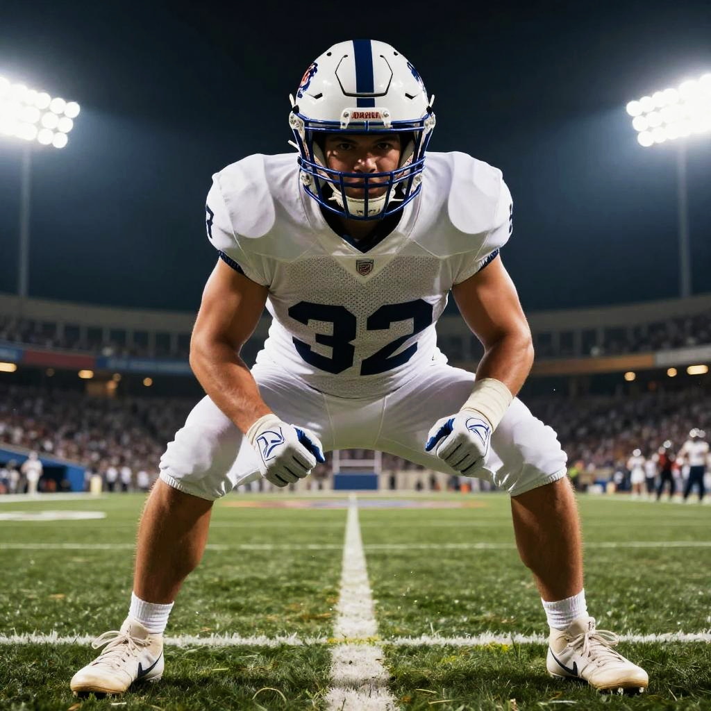 Football player pose standing confident with ball tucked under arm, urban graffiti wall as backdrop, futuristic sportswear with glowing accents, high contrast lighting with sharp shadows, bold and dynamic street art inspired style.