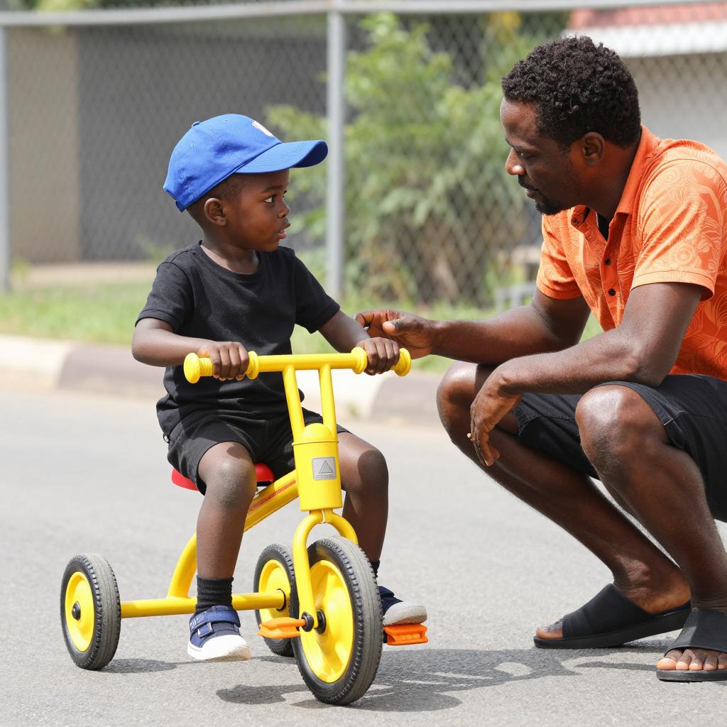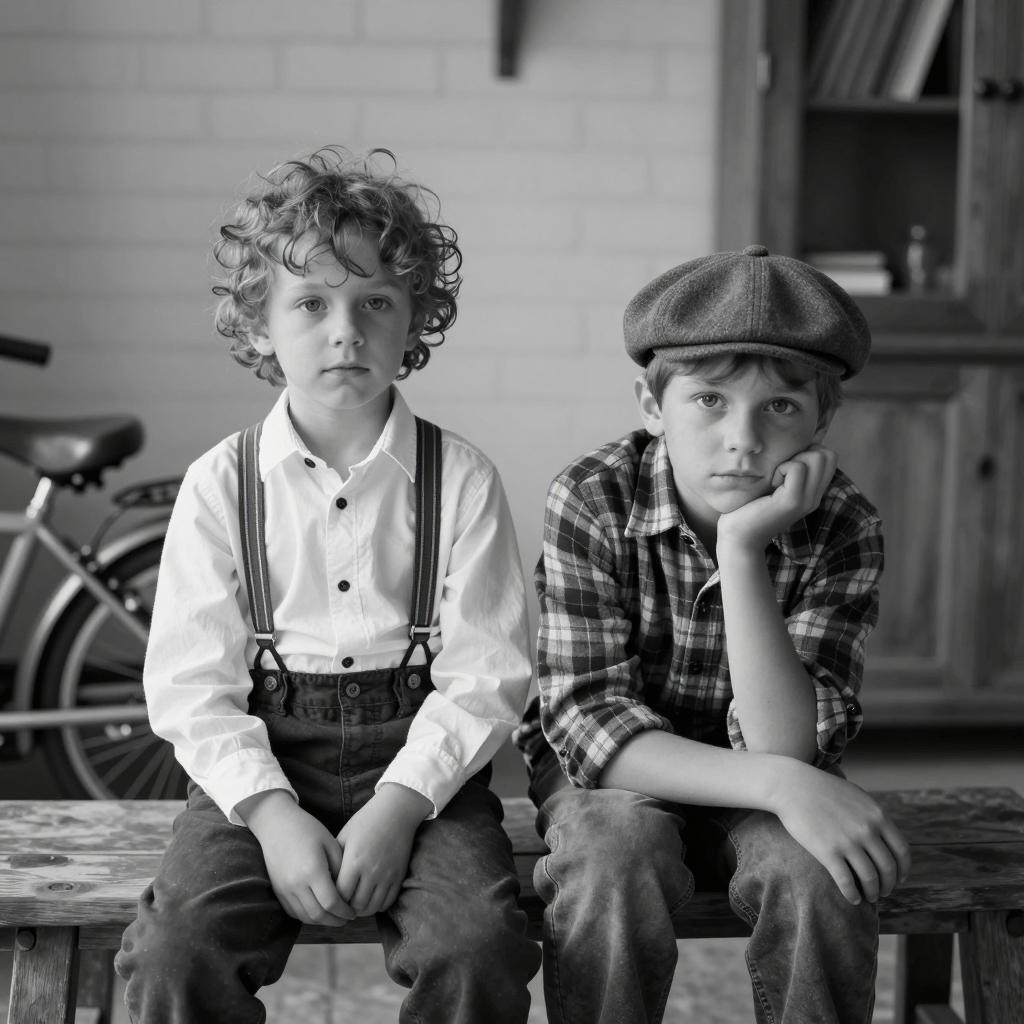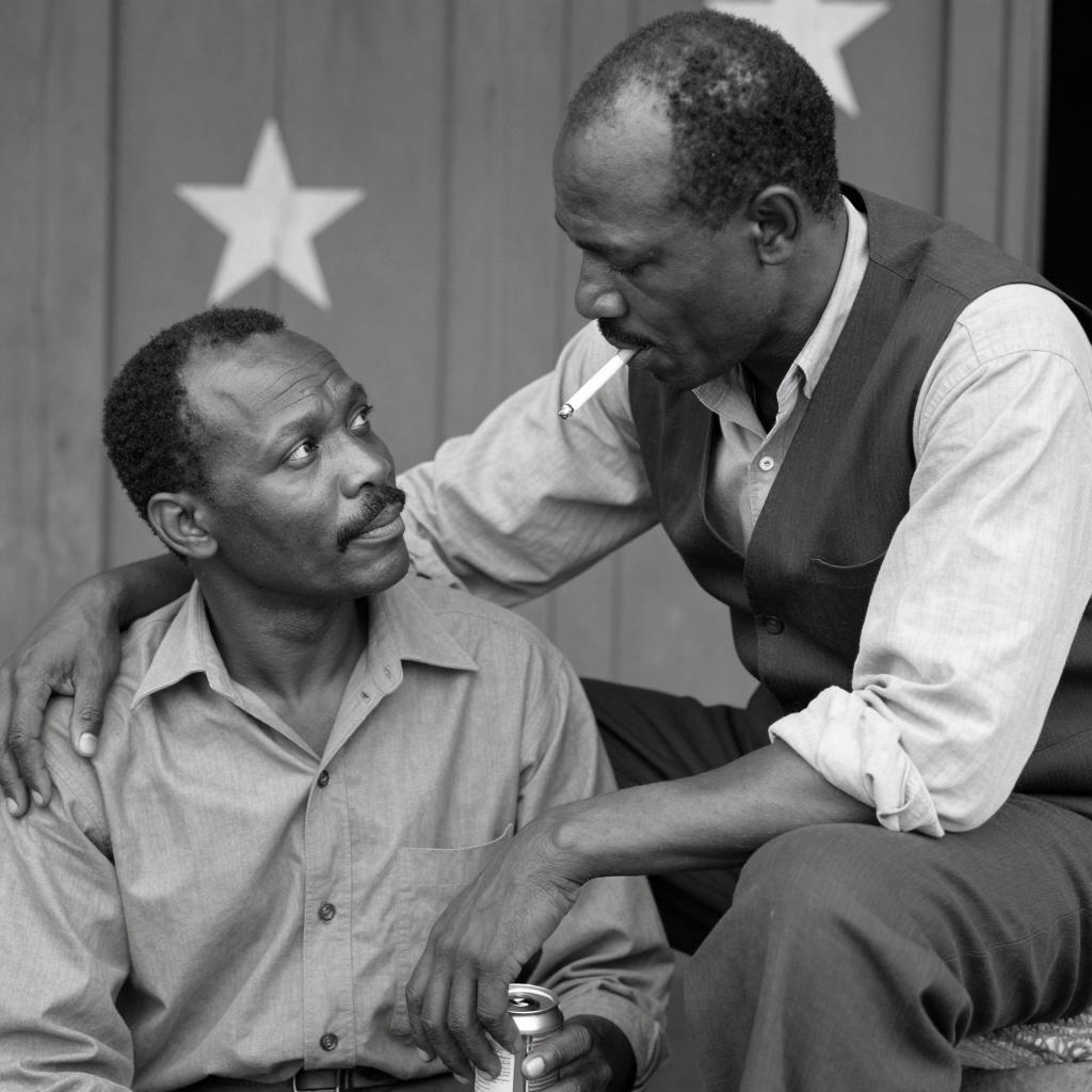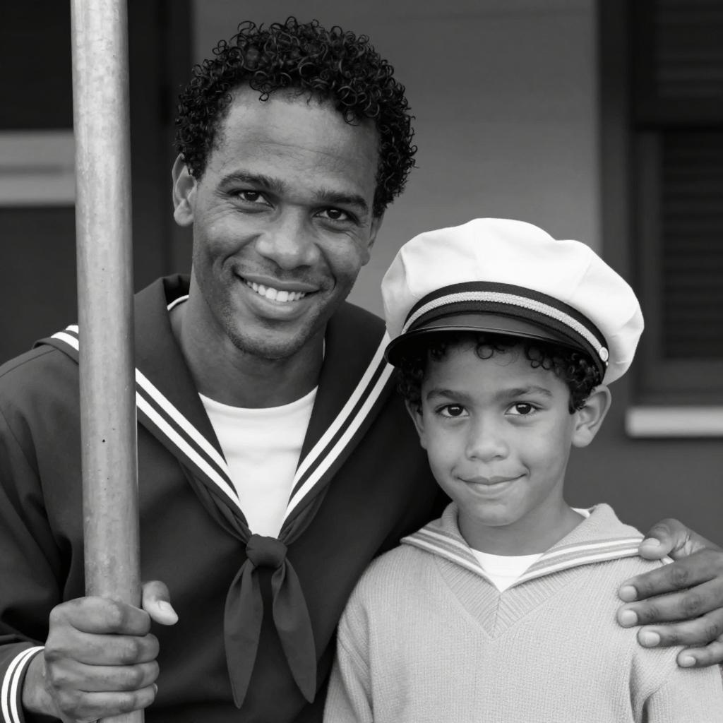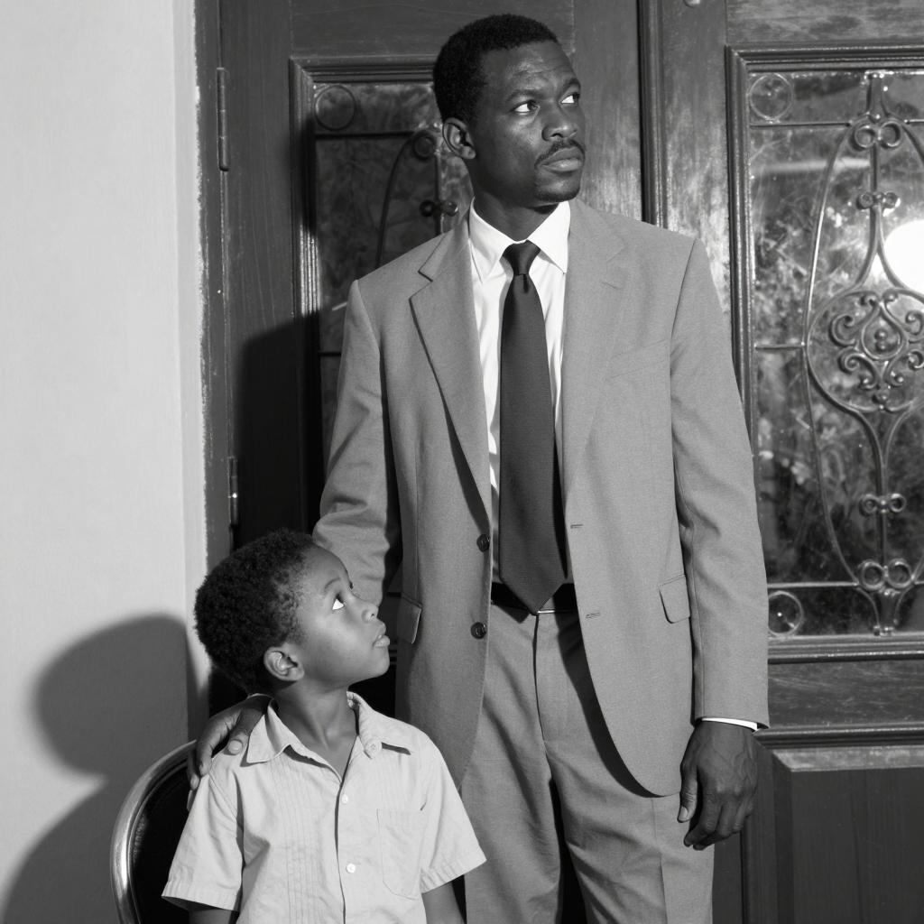 Black-and-white photograph of an African American man and boy. Man in light suit, dark tie, and white shirt, standing tall, looking to the right. Boy in short-sleeved shirt, looking up at man. Ornate door with patterned glass panels in background. Man's pants are partially unbuttoned. Chair in foreground. Shadow of person on left. Man's expression is serious. Boy's expression is curious. Two people.