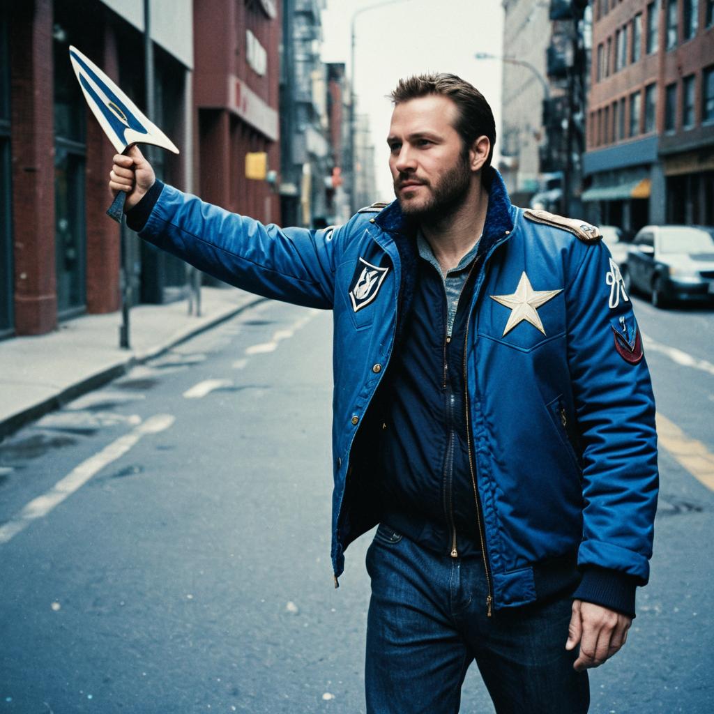 Photograph of a bearded Caucasian man with short brown hair, wearing a blue bomber jacket with a white star on the left chest and multiple patches, dark jeans, and a grey shirt. He is standing on a deserted urban street, holding a white and blue triangular flag in his right hand, raised above his head. The background includes red brick buildings and a yellow-painted sidewalk. The street is wet, suggesting recent rain. The man's expression is focused, and his stance is confident. The overall color palette is cool and urban.