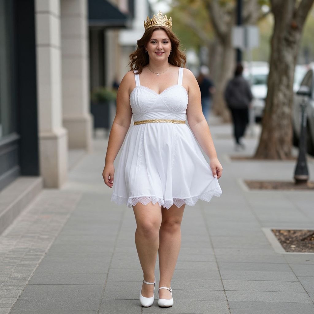 Plus Size Olympic Goddess Costume, a woman in a white dress and gold crown standing on a sidewalk