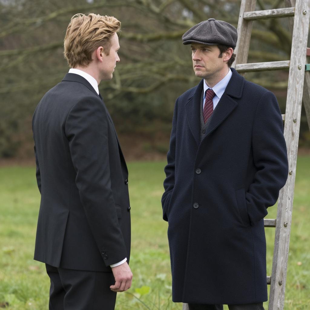 Man in gray overcoat, white shirt, and blue tie walking in a cemetery. Brown hair, serious expression. Green trash cans, stone tombstones, fallen leaves on ground. Daylight, trees in background. Mid-stride, right hand down, left hand forward.
