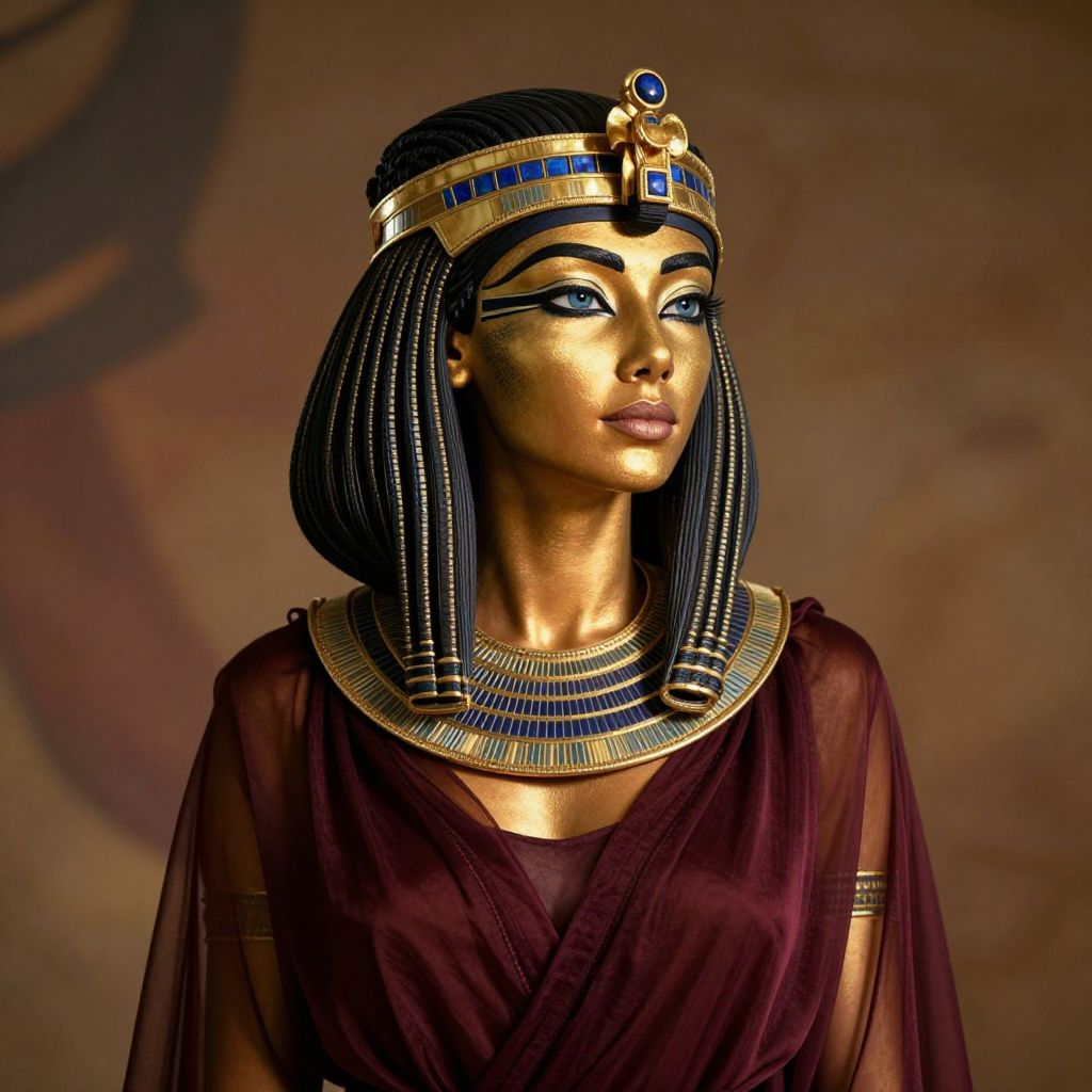 Photograph of an Egyptian-inspired woman with golden skin, black braided hair, blue and gold headdress, and dark maroon robe, set against