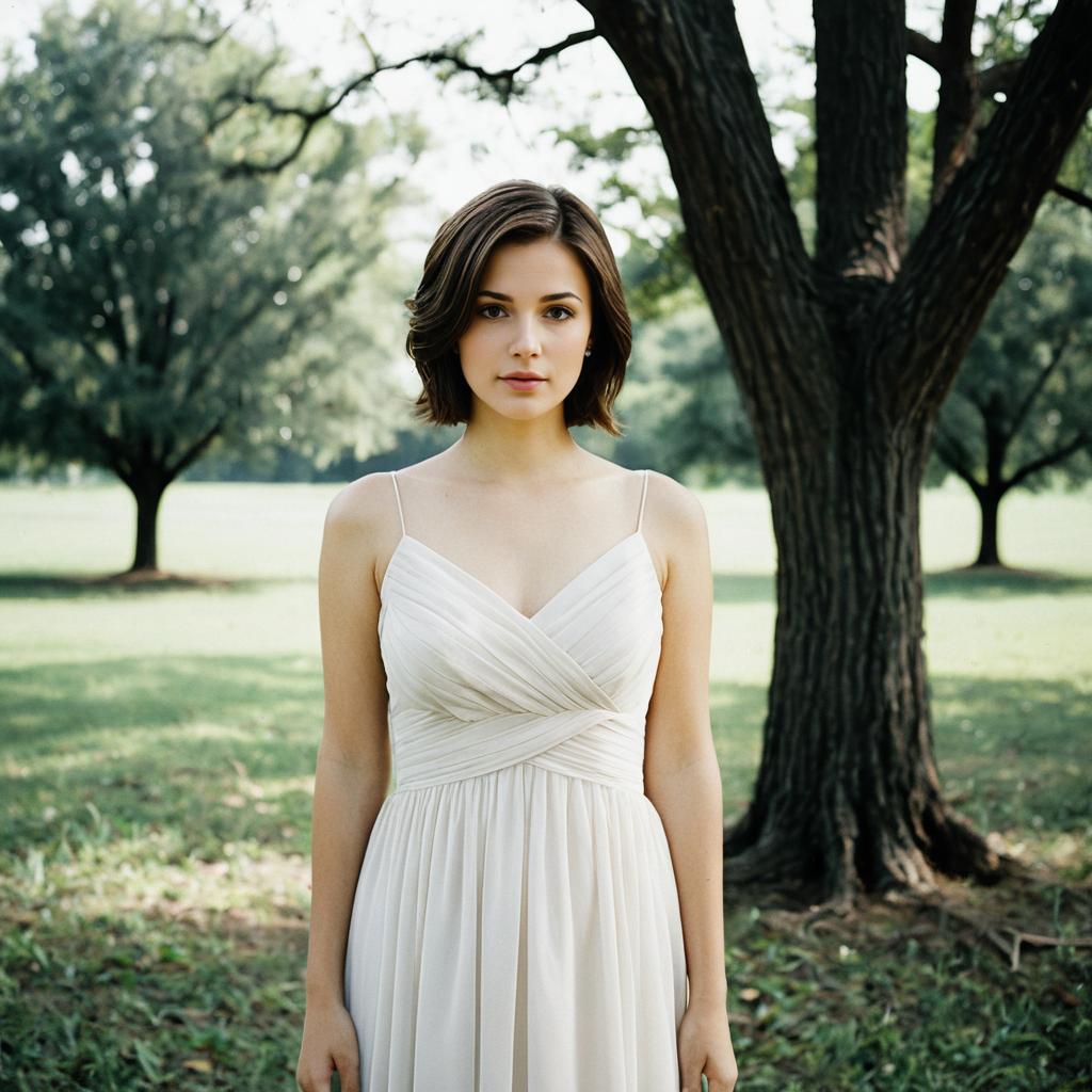 Chiffon bridesmaid dress,1girl, solo, dress, realistic, brown hair, looking at viewer, outdoors, standing, short hair, white dress, tree, photorealistic, brown eyes
