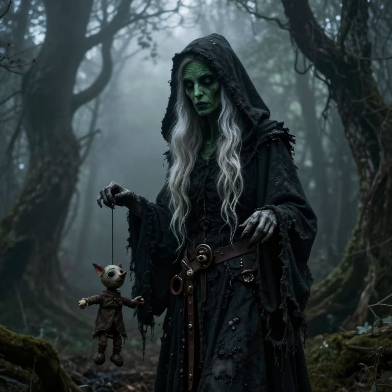 In a misty, eerie forest, an old hag stands shrouded in darkness. Her skin is a deep, dark green, contrasting sharply with her long, white, muddy hair that cascades down her back. Her pale eyes peer out from beneath a hood, giving her an otherworldly appearance. She is dressed in dark, tattered clothes, with a leather belt adorned with horrifying trinkets. A strange puppet hangs from her hands, adding to the unsettling atmosphere. The forest around her is dense and foreboding, with twisted trees and fog that envelop the scene, creating a sense of mystery and dread. The overall composition is dark and ominous, with the hag as the central figure, surrounded by the eerie forest and the mist that shrouds the scene.