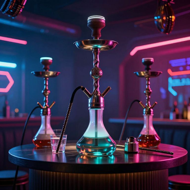 A highly detailed, intricately designed shisha bar in a cyberpunk style, featuring vibrant colors, glowing lights, and a futuristic atmosphere.