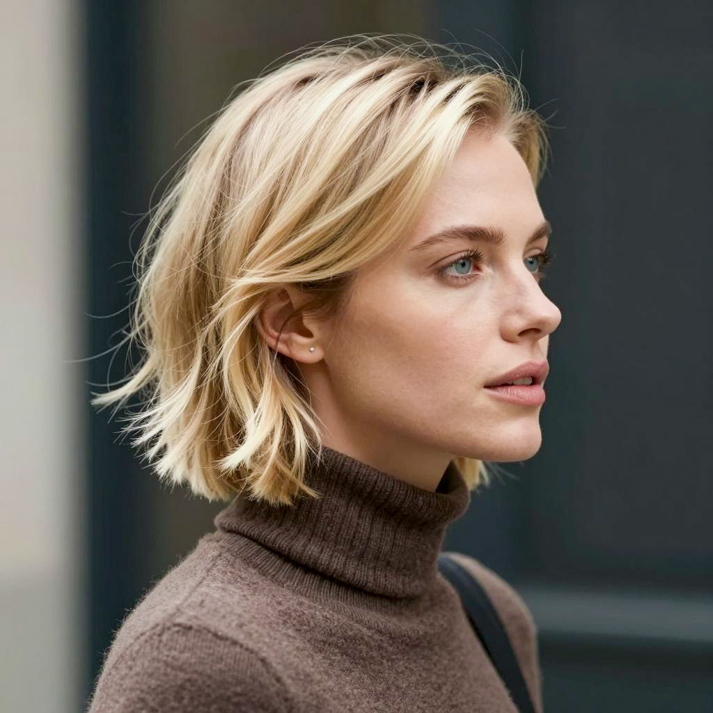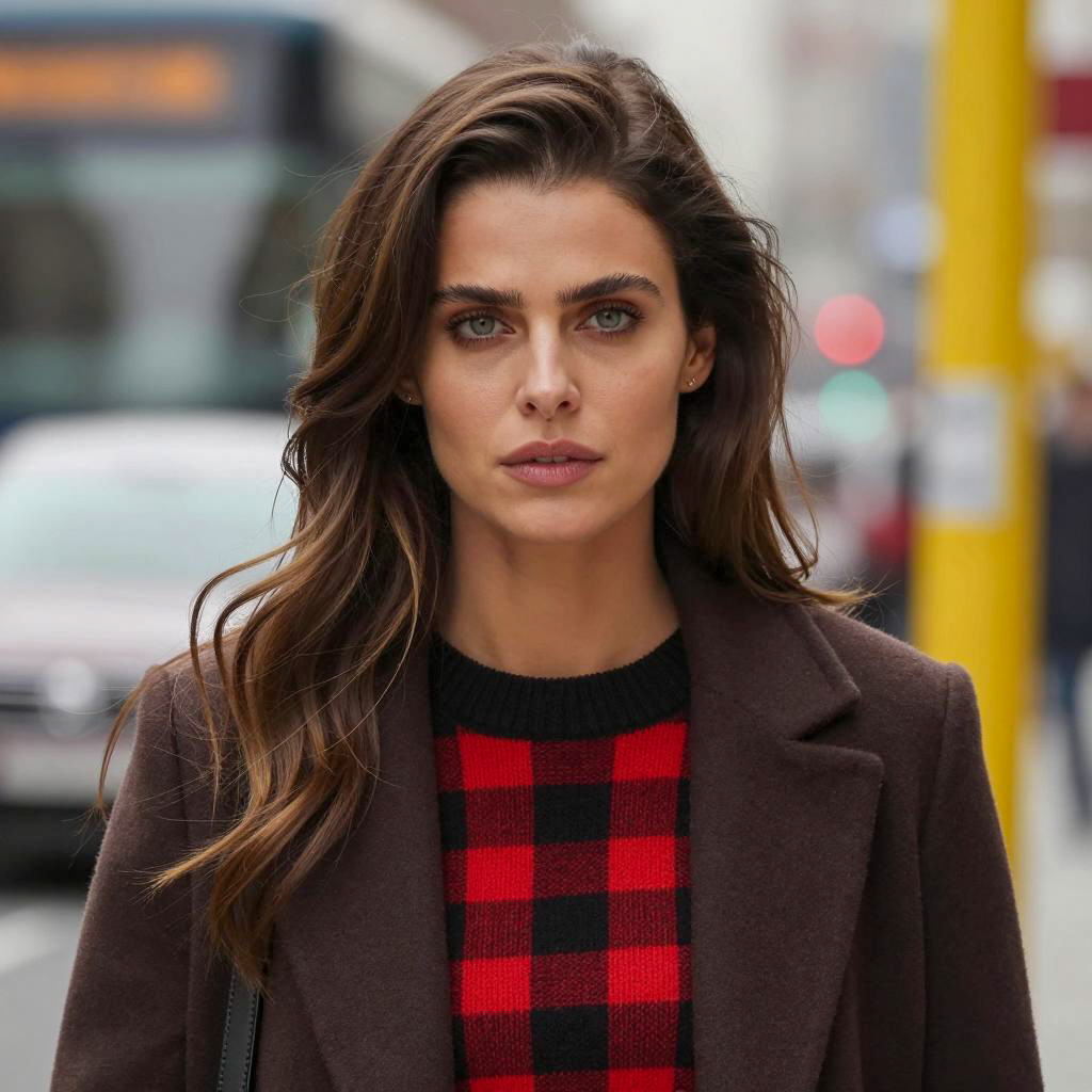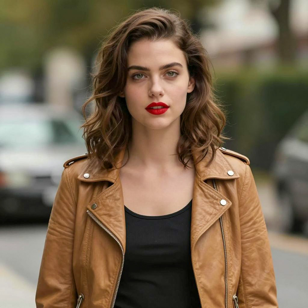 An artistic portrayal of a woman in a dark jacket standing confidently on the Brooklyn Bridge, with the iconic bridge cables and a dusky city skyline in the background.