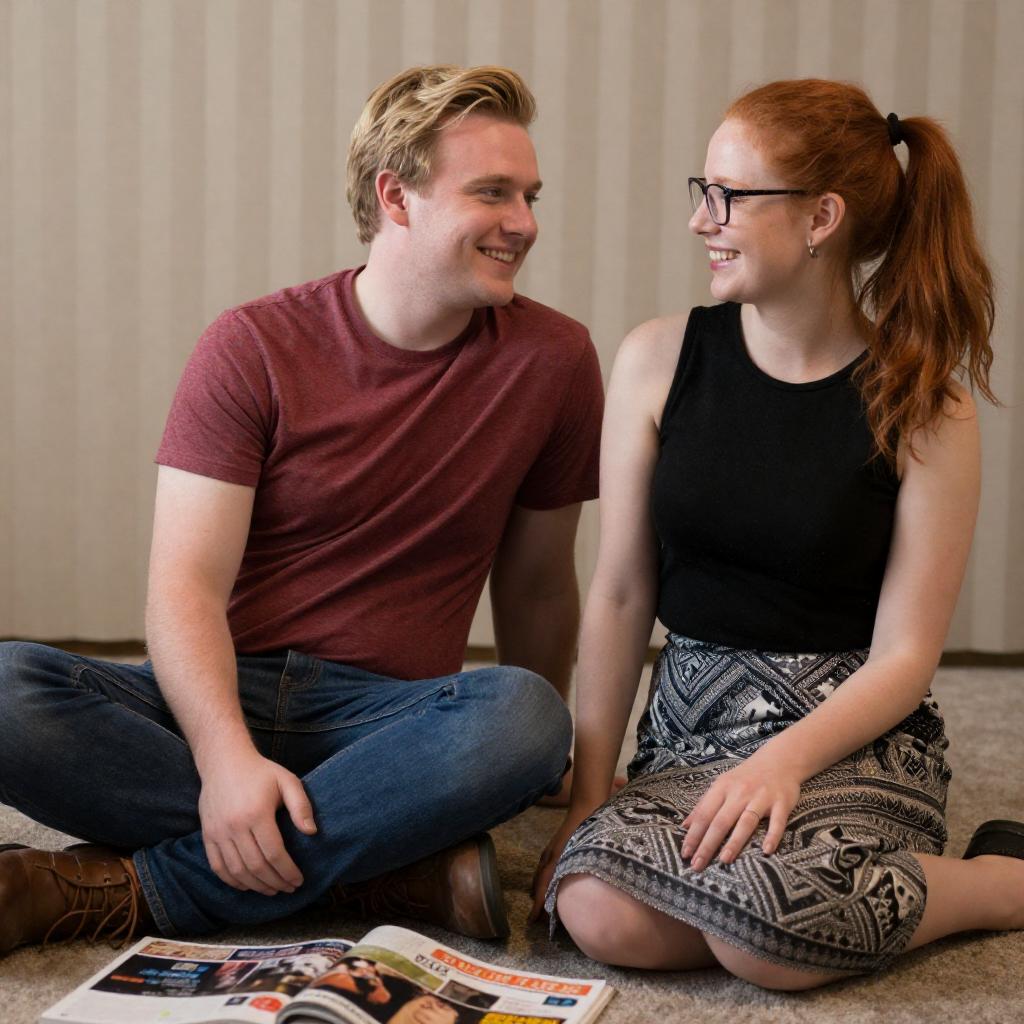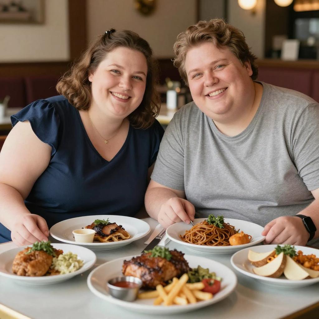 An overweight couple smiles at the camera while sitting at a restaurant table filled with plates of unhealthy food, highlighting a moment of indulgence.