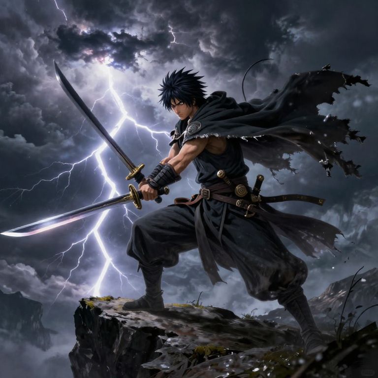 Dynamic anime-style drawing of a black-haired warrior, gripping a glowing sword, standing on a rocky cliff amid a thunderous, lightning-filled stormy sky