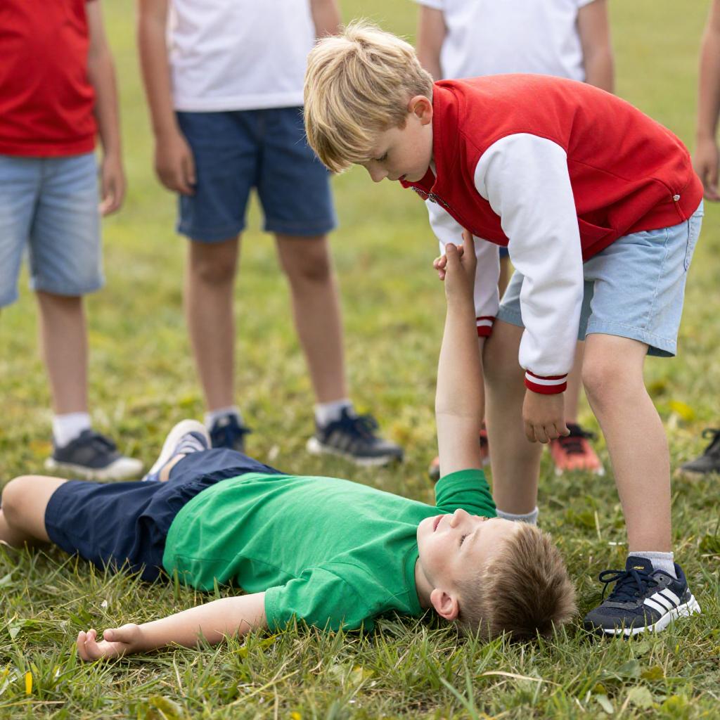 Photograph of children playing outside. Blonde boy in red and white jacket bends over green-shirted boy lying on grass. Multiple children around, wearing shorts and casual clothes. Blonde boy's face shows concern. Green-shirted boy's arm reaches up. Sunlit, grassy background.